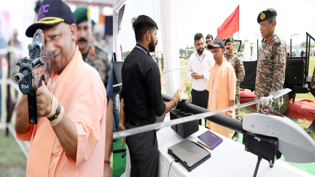 लखनऊ. सीएम योगी आदित्यनाथ अपने अंदाज के लिए जाने जाते हैं. ऐसे में एक बार फिर उनका नया अंदाज लखनऊ में आयोजित सशस्त्र सैन्य समारोह के उद्घाटन कार्यक्रम में देखने को मिला. जहां सीएम योगी ने सेना के सामने उनकी गन उठी ली और सीधे तान दी.