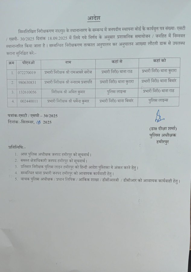 हमीरपुर SP दीक्षा शर्मा ने नंदराम प्रजापति को बिंवार थाने की जिम्मेदारी सौंपी है। जबकि रामआसरे सरोज को कुरारा थाने की कमान और निरीक्षक अमित कुमार को राठ थाना प्रभारी बनाया गया है।