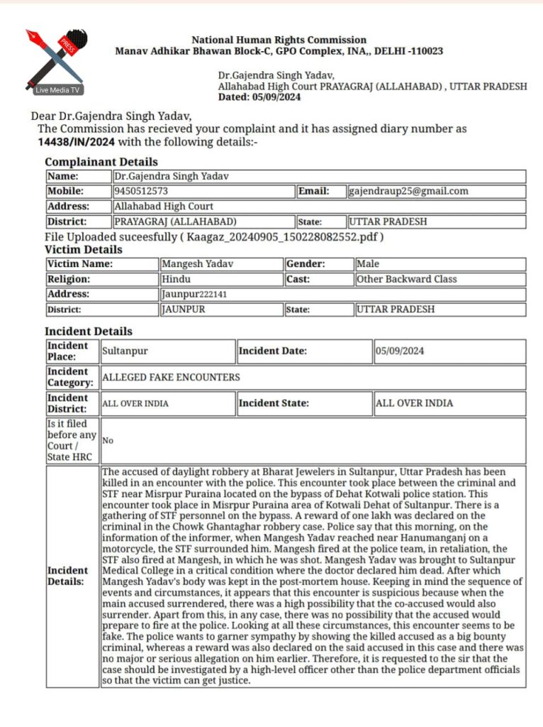 जौनपुर. मंगेश यादव की पुलिस मुठभेड़ में मौत पर संदेह जताते हुए इलाहाबाद हाईकोर्ट के वकील डॉ. गजेंद्र सिंह यादव ने मामले को राष्ट्रीय मानवाधिकार आयोग में दर्ज कराया है. जिसमें पुलिस विभाग के अलावा किसी उच्चस्तरीय जांच संस्था से जांच कराने की मांग की है.