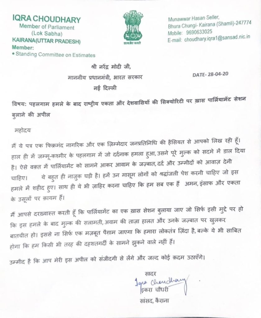 इकरा हसन ने कहा कि मैं ये पत्र एक फिक्रमंद नागरिक और एक जिम्मेदार जनप्रतिनिधि की हैसियत से आपको लिख रही हूं। हाल ही में जम्मू कश्मीर के पहलगाम में जो दर्दनाक हमला हुआ। उसने पूरे मुल्क को सदम में डाल दिया। ऐसे वक्त में पार्लियामेंट को सामने आकर आवाम के जज्बात, दर्द और उम्मीदों को आवाज देनी चाहिए। ये बहुत ही नाजुक घड़ी है। हमें उन मासूम लोगों को श्रद्धांजली पेश करना चाहिए जो इस हमले में शहीद हुए। साथ ही ये भी जाहिर करना चाहिए कि हम सब एक है। अमन, इंसाफ और एकता के उसूलों पर कायम हैं।