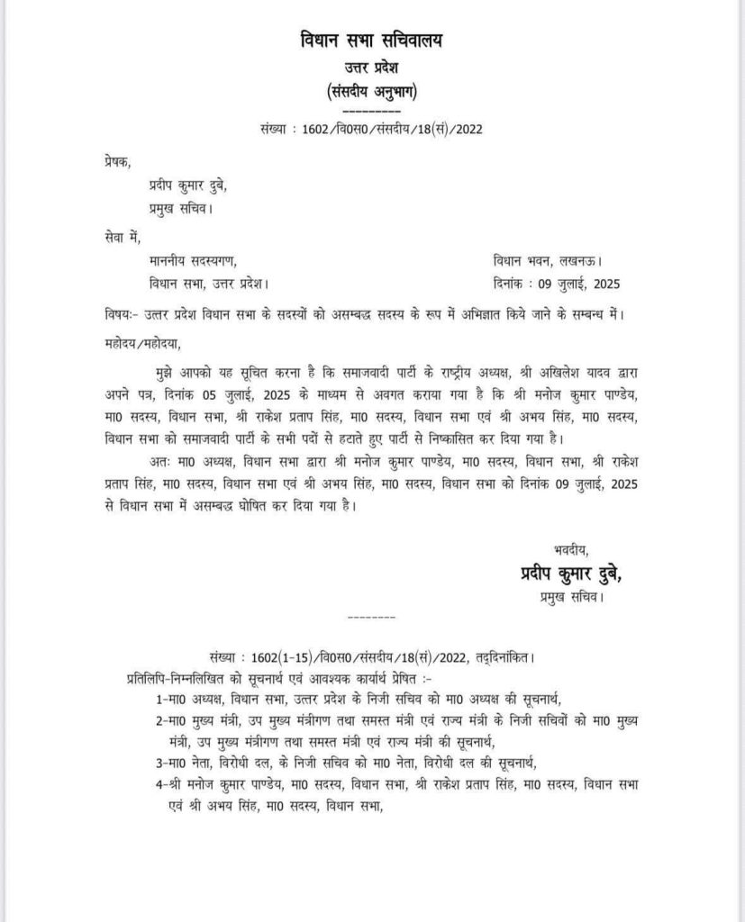 बता दें कि पिछले महीने ही अखिलेश यादव ने इन तीनों विधायकों पर तंज कसते हुए कहा था कि तीनों के मंत्री बनने में आ रही दिक्कतें निष्काषित करने पर खत्म हो जाएगी. इसीलिए उनकी टेक्निकल बाधा को भी दूर कर दे रहा हूं. वहीं विधानसभा उत्तर प्रदेश के प्रमुख सचिव प्रदीप दुबे के द्वारा जारी पत्र में ये दर्शाया गया है कि, 5 जुलाई 2025 को समाजवादी पार्टी के राष्ट्रीय अध्यक्ष अखिलेश यादव ने लिखा था कि मनोज पांडेय, राकेश प्रताप सिंह और अभय सिंह को समाजवादी पार्टी द्वारा निष्कासित कर दिया गया है. जबकि, पत्र में प्रमुख सचिव प्रदीप दुबे द्वारा विधानसभा अध्यक्ष के अनुशंसा पर तीनों सदस्यों को असम्बद्ध घोषित कर दिया गया है.