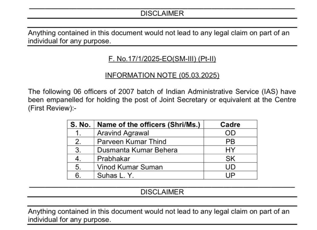 लखनऊ. 2007 बैच के 6 IAS अधिकारियों को भारत सरकार में ज्वॉइंट सेक्रेटरी के पद के लिए इम्पैनल्ड किए गए हैं. जिसमें आईएएस सुहास एलवाई का भी नाम शामिल है. उनके अलावा IAS अराविंद अग्रवाल, IAS प्रवीण कुमार थिंड, IAS दुष्मंता कुमार, IAS प्रभाकर और IAS विनोद कुमार का नाम शामिल है.