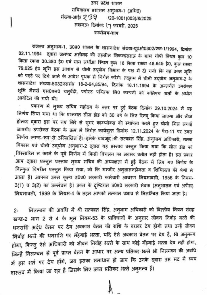 योगी सरकार में बतौर मुख्य सचिव का पद संभालने के बाद भी मनोज कुमार सिंह विवादित फैसले लेने से पीछे नहीं हट रहे हैं. मुख्य सचिव ने नियमों को ताक पर रखकर एक शुगर मिल के लीज डीड को रिन्यू करने के लिए प्रमुख सचिव वीना कुमार मीणा को मौखिक आदेश दे दिया है. जिसके बाद अब दोनों में ठन गई है. ये विवाद इतना बढ़ गया कि मनोज कुमार सिंह ने अपने स्तर से दो अनुभाग अधिकारियों को निलंबित करते हुए वीना कुमार मीणा के खिलाफ अनुशासनात्मक कार्रवाई के लिए नियुक्ति विभाग को पत्र भी लिख दिया है.