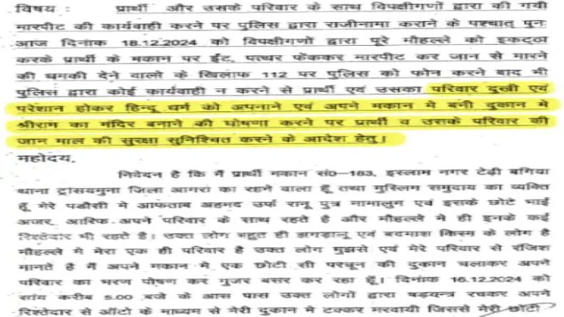 आगे बदरुद्दीन ने चिट्ठी में लिखते हुए बताया कि बेटी को टक्कर मारने के 2 दिन बाद 18 दिसंबर को उसके घर पर कुछ मुस्लिम लोग पहुंचे और इस दौरान जमकर ईंट-पत्थर बरसाए. इस दौरान बेटियों के साथ बदसलूकी भी की. वहीं जब इसका विरोध किया तो मारपीट की. घटना के बाद पुलिस को फोन किया तो पुलिस मौके पर पहुंची, लेकिन कोई कार्रवाई नहीं की गई. ऐसे में मेरा पूरा परिवार हिंदू धर्म अपनाना चाहता है. साथ ही उसने ये भी बताया कि उसने अपनी दुकान में श्रीराम का मंदिर का भी फैसला लिया है.