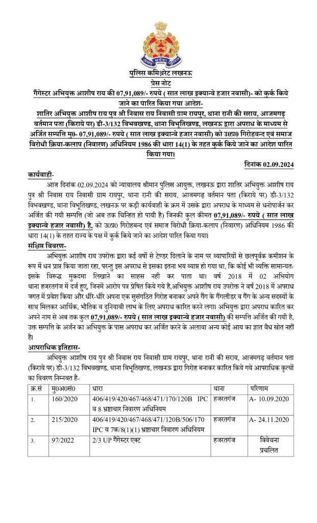 सोमवार को पुलिस कमिश्नर अमरेंद्र कुमार ने विभूतिखंड निवासी आशीष राय की संपत्ति कुर्क करने का आदेश दिया। आशीष राय मूल रूप से आजमगढ़ का रहने वाला है। उसके गिरोह में एके राजीव और पूर्व आईपीएस अरविंद सेन भी शामिल थे। आरोपियों ने साल 2018 में मध्य प्रदेश के इंदौर निवासी मंजीत भाटिया को पशुपालन विभाग में आटा सप्लाई का टेंडर दिलाने की बात कही थी।