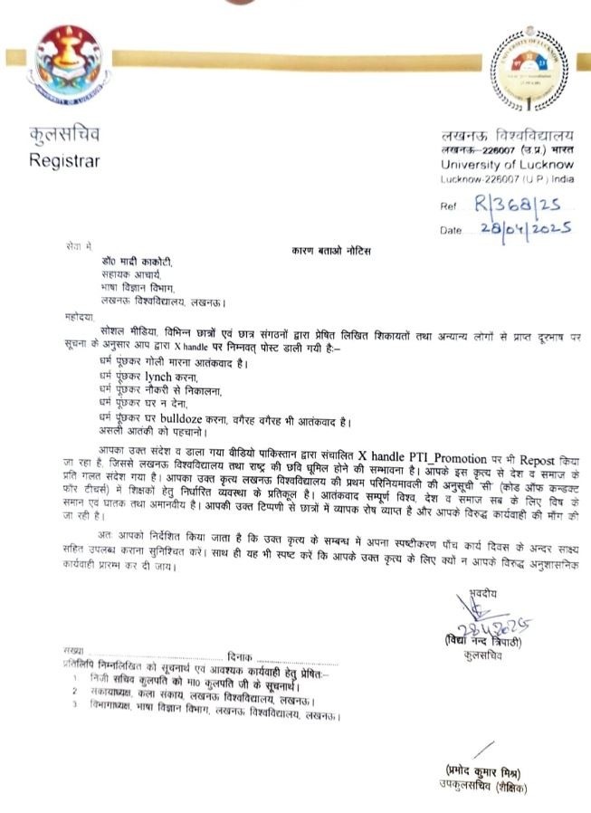 लखनऊ यूनिवर्सिटी प्रशासन ने इन सब के बीच असिस्टेंट प्रोफेसर डॉ. माद्री काकोटी से पांच दिन के भीतर जवाब मांगा है। मामले की गंभीरता देखते हुए विवि प्रशासन ने जल्द से जल्द स्पष्टीकरण मांगा है ताकि आगे की कार्रवाई की जा सके। यूनिवर्सिटी प्रशासन ने बताया कि उनका पोस्ट पाकिस्तान से संचालित सोशल मीडिया हैंडल्स द्वारा बड़े स्तर पर शेयर किया जा रहा है। उन्होंने इस कृत्य को देश और समाज के प्रति गलत संदेश देने वाला माना।