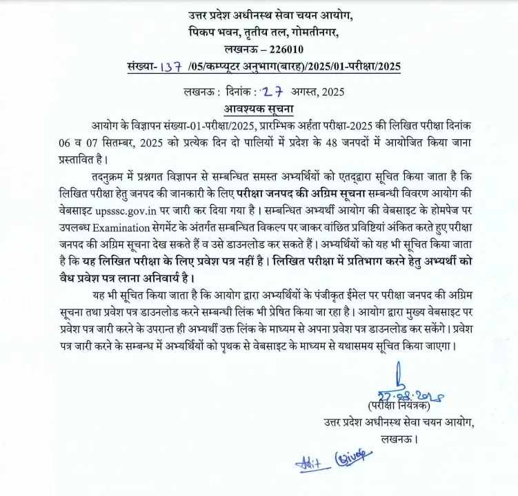 लखनऊ. 6 और 7 सितंबर को उत्तर प्रदेश अधीनस्थ सेवा चयन आयोग की प्रारंभिक परीक्षा प्रदेश के 48 जिलों में दो पालियों में आयोजित की जाएगी. आयोग ने अपनी वेबसाइट पर जनपदों की सूची जारी कर दी है. आयोग द्वारा अभ्यर्थियों के पंजीकृत ईमेल पर परीक्षा जनपद की अग्रिम सूचना और प्रवेश पत्र डाउनलोड करने सम्बन्धी लिंक भी प्रेषित किया जा रहा है. आयोग द्वारा मुख्य वेबसाइट पर प्रवेश पत्र जारी करने के बाद ही अभ्यर्थी उक्त लिंक के माध्यम से अपना प्रवेश पत्र डाउनलोड कर सकेंगे.