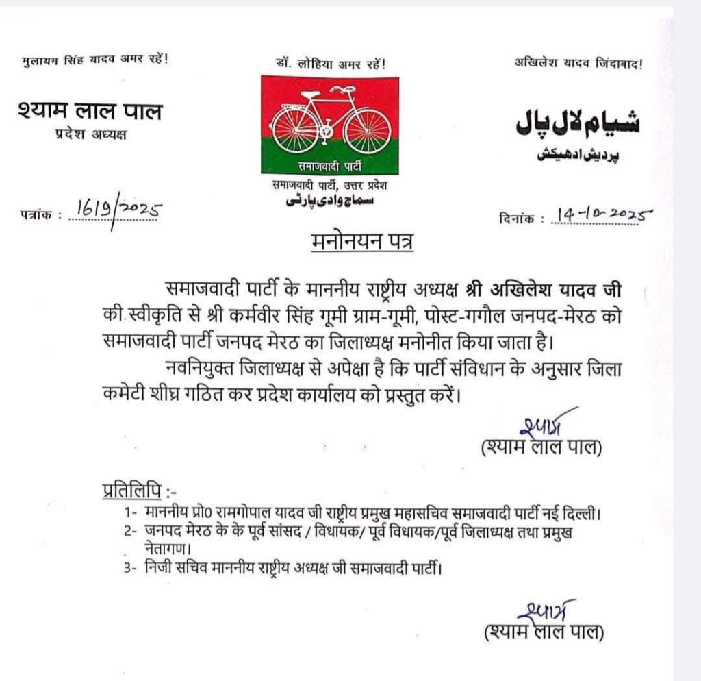 मेरठ। समाजवादी पार्टी मिशन 2027 की तैयारी में जुट गई है। सपा मुखिया अखिलेश यादव ने पार्टी के कार्यकर्ताओं को जमीन स्तर में जाकर पार्टी की जनता से जुड़ने की बात कही है। इसी बीच समाजवादी पार्टी ने मेरठ जिला संगठन में बड़ा फेरबदल किया है। जिलाध्यक्ष विपिन चौधरी को हटाकर कर्मवीर गुर्जर को नया जिलाध्यक्ष नियुक्त किया है। पार्टी ने विपिन चौधरी के अनुभव का सम्मान करते हुए उन्हें प्रदेश स्तर पर जिम्मेदारी दी है।