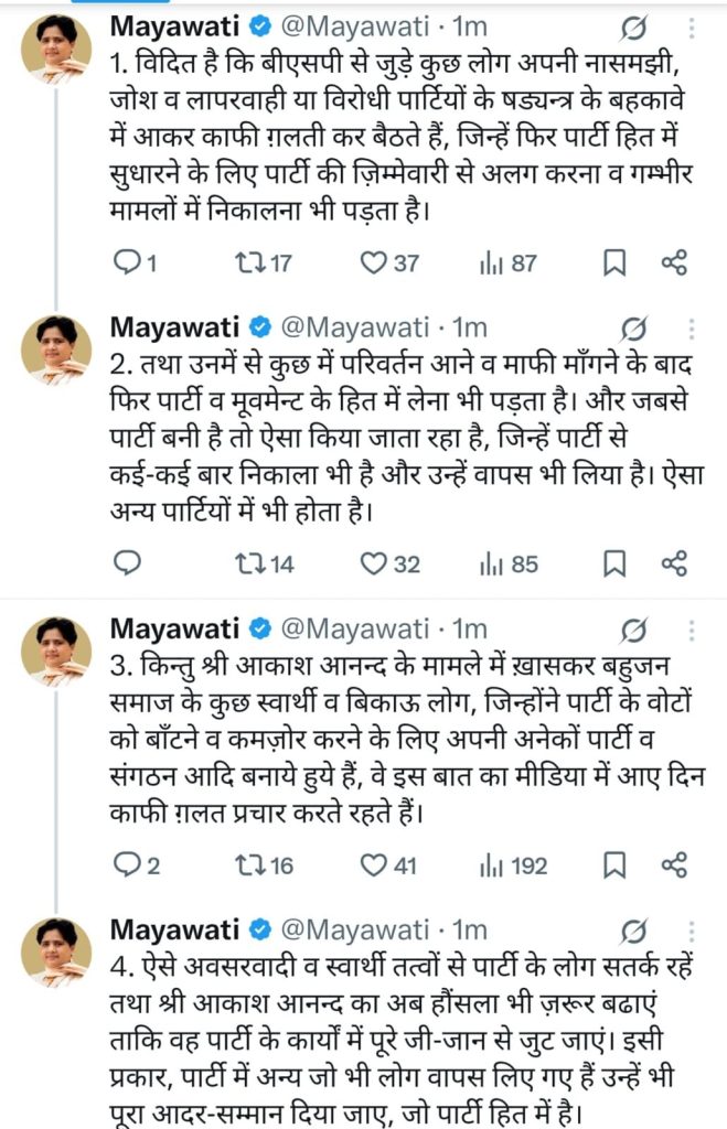 साथ ही मायावती ने पार्टी कार्यकर्ताओं से सावधान रहने की अपील करते हुए कहा कि “ऐसे अवसरवादी व स्वार्थी तत्वों से पार्टी के लोग सतर्क रहें तथा श्री आकाश आनन्द का अब हौंसला भी ज़रूर बढाएं ताकि वह पार्टी के कार्याें में पूरे जी-जान से जुट जाएं. इसी प्रकार, पार्टी में अन्य जो भी लोग वापस लिए गए हैं उन्हें भी पूरा आदर-सम्मान दिया जाए, जो पार्टी हित में है.”
