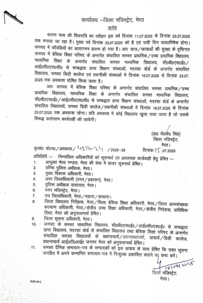 DM मेरठ डॉ. वी.के. सिंह ने आदेश जारी करते हुए कहा कि जिले के सभी स्कूल और कॉलेज 16 जुलाई से 23 जुलाई तक बंद (School College Closed) रहेंगे। यह निर्णय श्रद्धालुओं की सुरक्षा और सुगम आवागमन को ध्यान में रखते हुए लिया गया है। उन्होंने आगे कहा कि सभी शिक्षण संस्थान सरकारी, निजी, बेसिक व उच्च शिक्षा इस आदेश के तहत बंद रहेंगे।