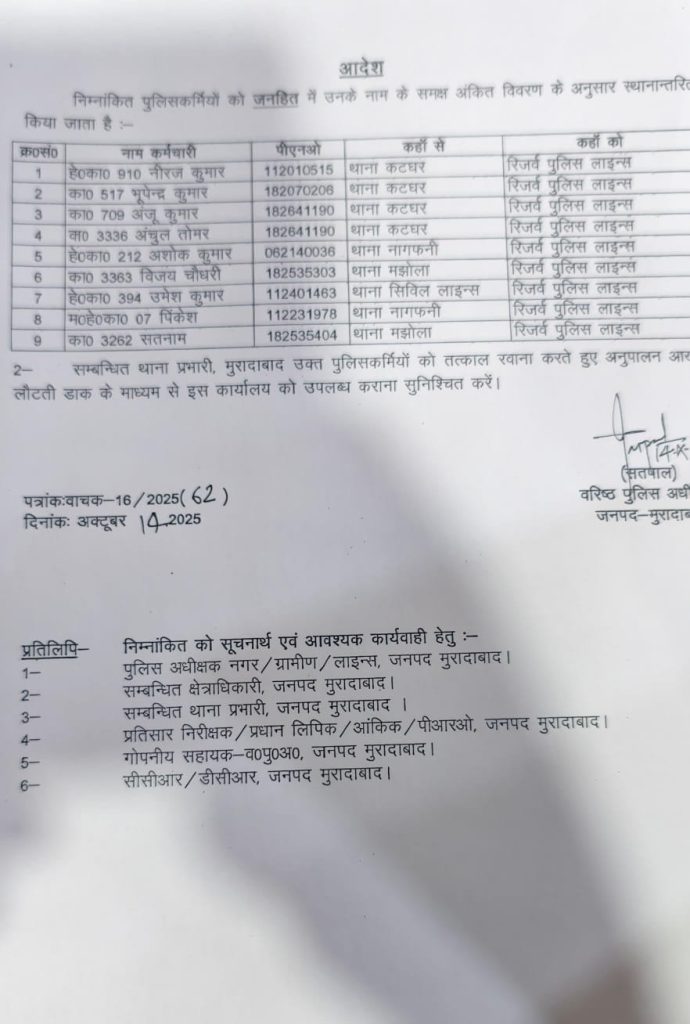 मुरादाबाद। उत्तर प्रदेश के मुरादाबाद जिले के पुलिस विभाग में बड़ा फेरबदल किया गया है। एसएसपी सतपाल अंतिल ने जिले के 9 पुलिसकर्मियों को लाइन हाजिर किया है। उनके खिलाफ कटघर थाने के 4 कर्मियों ने शिकायत की थी। पुलिसकर्मियों पर काम में लापरवाही का आरोप लगा था। जिसके बाद एसएसपी सतपाल अंतिल ने उन्हें लाइन हाजिर कर दिया।