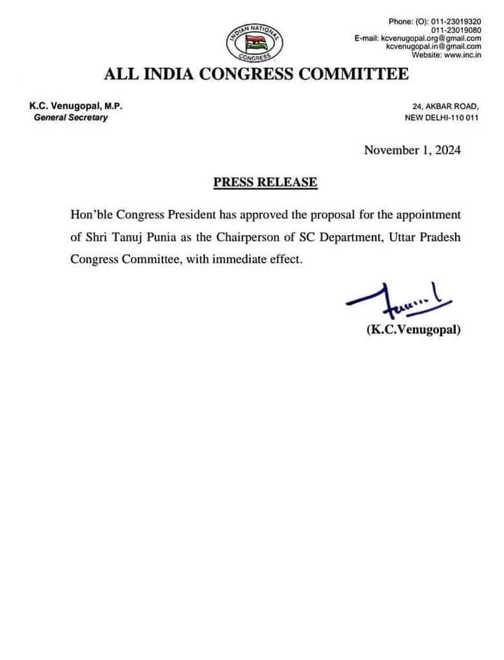 लखनऊ. बाराबंकी सांसद तनुज पुनिया को बड़ी जिम्मेदारी मिला है. उन्हें यूपी कांग्रेस अनुसूचित जाति विभाग का चेयरमैन बनाया गया है. इस संबंध में कांग्रेस राष्ट्रीय महासचिव केसी वेणुगोपाल ने आदेश जारी किया है.
