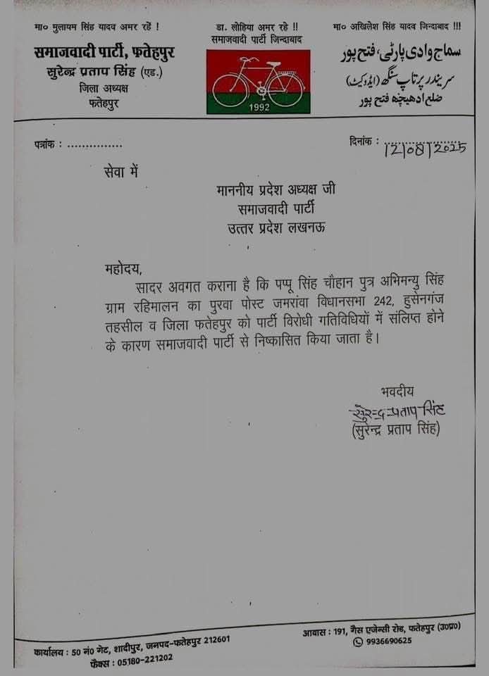 अखिलेश की पार्टी से निष्कासित होने के बाद पप्पू सिंह चौहान ने कहा कि मैं 2021 से पार्टी से जुड़ा हूं। मैंने पार्टी के लिए हुसैनगंज विधानसभा क्षेत्र में बहुत काम किया है। सपा पार्टी में केवल मुस्लिम समुदाय के लोगों का ही बोलबाला है। सपा की फतेहपुर ईकाई को मुस्लिम समुदाय के लोग ही चला रहे हैं। ये लोग किसी हिंदू समाज के व्यक्ति को अपने आगे नहीं आना देना चाहते हैं।