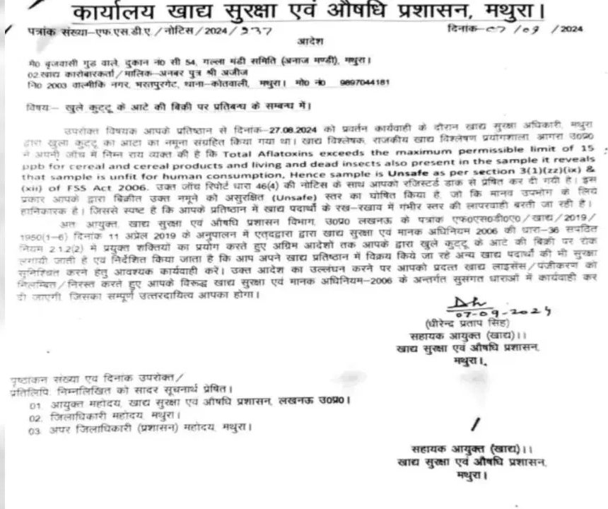 बता दें कि मथुरा में 27 अगस्त को ढाई सौ लोग फूड पॉइजनिंग के शिकार हुए थे. इन सभी लोगों ने 26 अगस्त (श्रीकृष्ण जन्माष्टमी) की रात कुट्टू के आटे की पूड़ी और पकौड़ी खाई थी. जिसके बाद सभी की हालत खराब हो गई थी. लोगों को तत्काल अस्पताल में भर्ती कराया गया था. इस घटना के बाद ही मथुरा डीएम ने खाद्य सुरक्षा विभाग को जांच का आदेश दिया था. टीम ने पांच व्यापारियों राकेश गोयल, अमित अग्रवाल, मथुरा के गोविंद नगर थाना क्षेत्र में रमन टॉवर से अंकुर अग्रवाल, बिरला मंदिर के पास नवीन अग्रवाल और गल्ला मंडी से ब्रजवासी गुड़ वाले के प्रतिष्ठान से सैंपल भी लिए थे.
