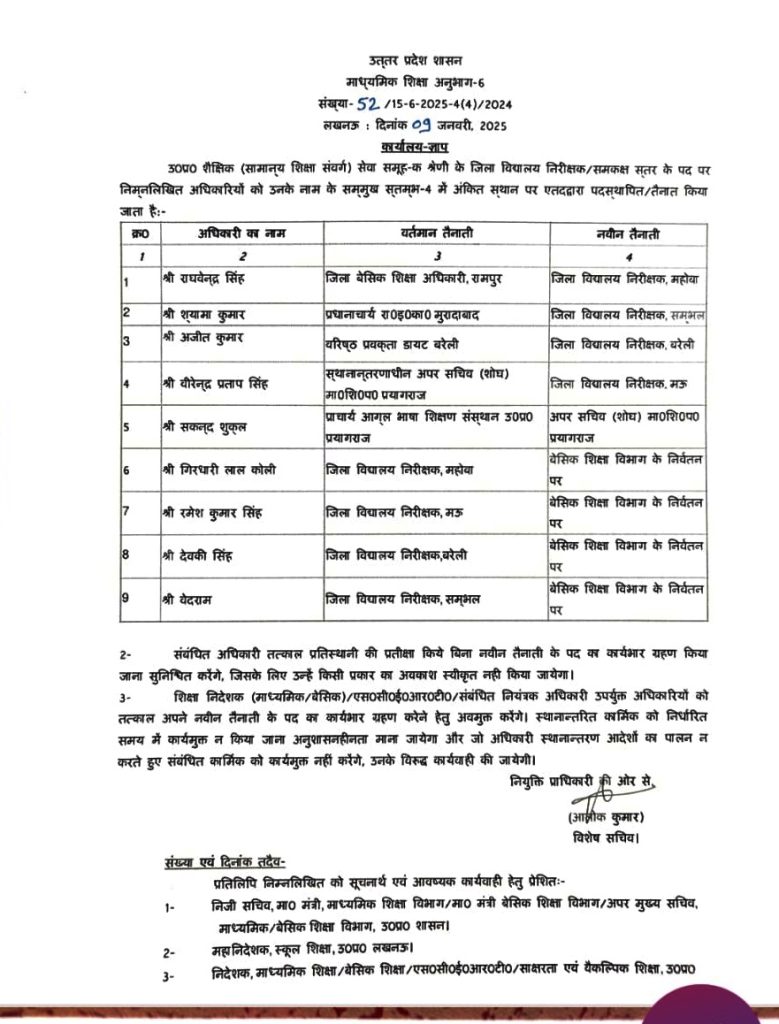 लखनऊ। उत्तर प्रदेश में इन दिनों तबादला एक्सप्रेस चल रही है। आईएएस और आईपीएस अधिकारियों का ट्रांसफर करने के बाद अब माध्यमिक शिक्षा विभाग में बड़ा फेरबदल किया गया है। विभाग ने आधा दर्जन से भी ज्यादा शिक्षा अधिकारियों का ट्रांसफर कर दिया है। प्रदेश के 4 जिलो में नए डिस्ट्रिक्ट इंस्पेक्टर ऑफ स्कूल की तैनाती कई गई है। वहीं कई जिलों के DIOS को बेसिक शिक्षा विभाग के निवर्तन पर भेजकर तत्काल कार्यभार ग्रहण करने के फरमान जारी किए गए है।