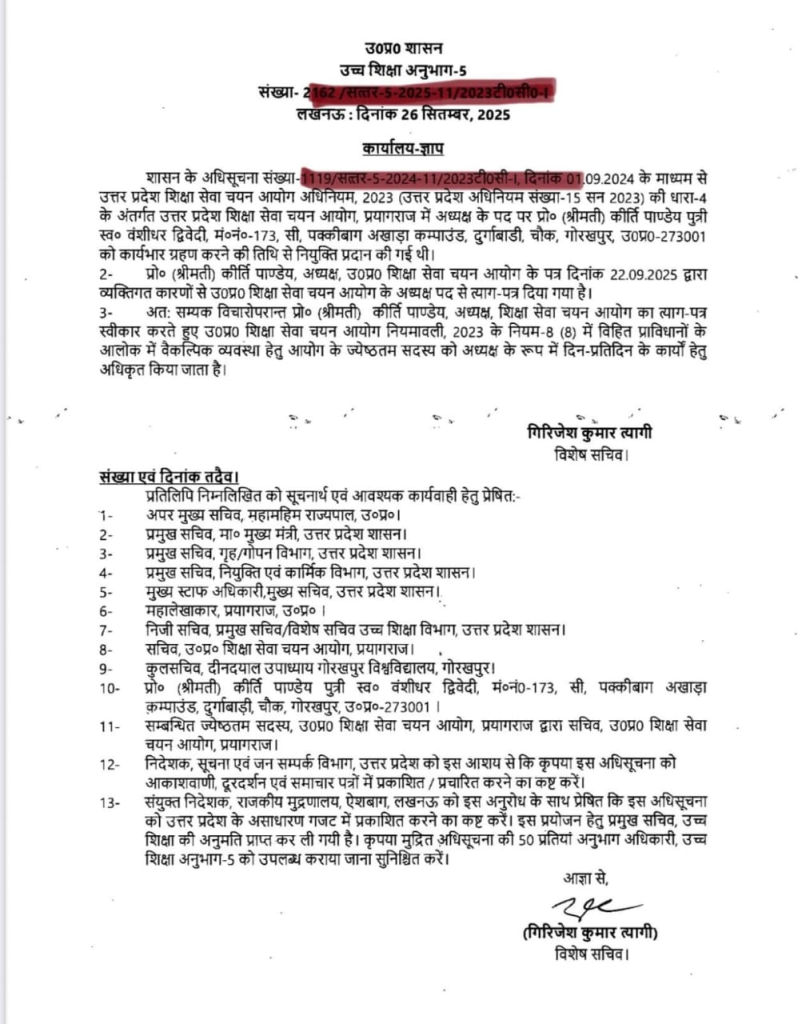 गोरखपुर। उत्तर प्रदेश शिक्षा सेवा चयन आयोग की अध्यक्ष प्रोफेसर कीर्ति पांडे ने इस्तीफा दे दिया है। इस्तीफे का कारण व्यक्तिगत बताया गया है। पिछले साल इन्हें इसी महीने आयोग का अध्यक्ष बनाया गया था। बता दें कि प्रोफेसर कीर्ति पांडेय गोरखपुर यूनिवर्सिटी में पढ़ाती हैं। उनके अचानक इस्तीफे से शिक्षा विभाग में अचरज का माहौल है।