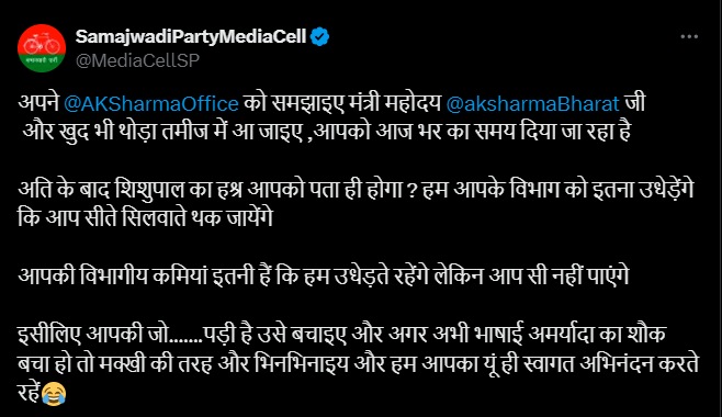 इतना ही नहीं सपा ने एक अन्य पोस्ट में लिखा है कि ‘अपने @AKSharmaOffice को समझाइए मंत्री महोदय @aksharmaBharat जी और खुद भी थोड़ा तमीज में आ जाइए ,आपको आज भर का समय दिया जा रहा है अति के बाद शिशुपाल का हश्र आपको पता ही होगा ? हम आपके विभाग को इतना उधेड़ेंगे कि आप सीते सिलवाते थक जायेंगे आपकी विभागीय कमियां इतनी हैं कि हम उधेड़ते रहेंगे लेकिन आप सी नहीं पाएंगे इसीलिए आपकी जो…….पड़ी है उसे बचाइए और अगर अभी भाषाई अमर्यादा का शौक बचा हो तो मक्खी की तरह और भिनभिनाइय और हम आपका यूं ही स्वागत अभिनंदन करते रहें’.