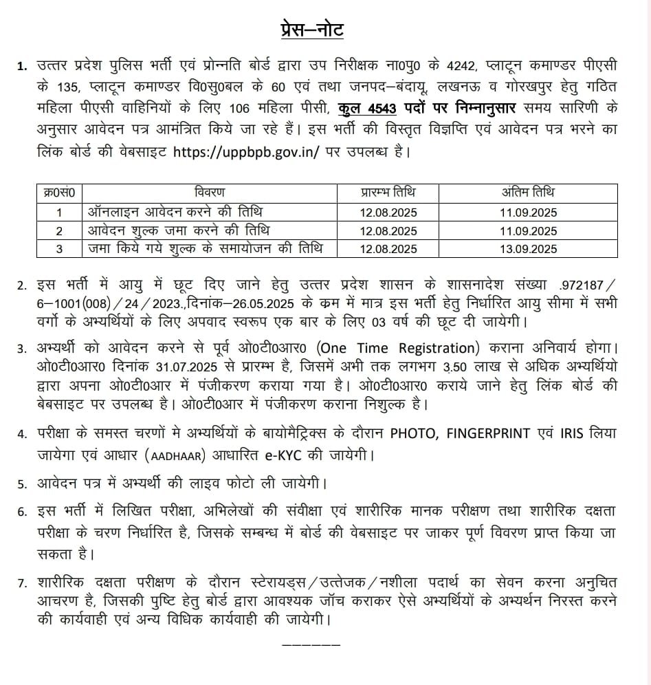 UP Police Recruitment 2025: उत्तर प्रदेश में सरकारी नौकरी की तैयारी कर रहे युवाओं के लिए खुशखबरी है। उत्तर प्रदेश पुलिस भर्ती एवं प्रोन्नति बोर्ड ने यूपी पुलिस में 4542 पदों की भर्ती की नोटिफिकेशन जारी कर दी है। आवेदन प्रक्रिया 12 अगस्त 2025 से शुरू होकर 11 सितंबर 2025 तक चलेगी।