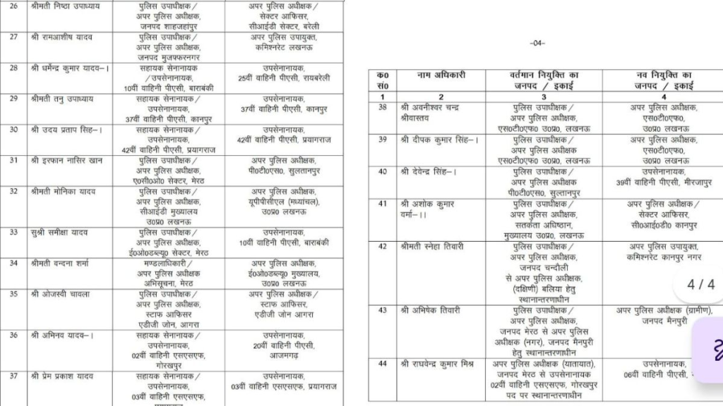 UP POLICE TRANSFER: उत्तर प्रदेश में एक बार फिर तबादला एक्सप्रेस चली है। योगी सरकार ने कानून व्यवस्था को मजबूत करने के लिए 44 एडिशनल SP का ट्रांसफर किया है। पीपीएस अधिकारी तनु उपाध्याय को 37वीं वाहिनी पीएसी कानपुर में नई तैनाती मिली है। अरविंद कुमार वर्मा को चित्रकूट से हमीरपुर, ब्रज नारायण सिंह को लखनऊ कमिश्नरेट से सुल्तानपुर और यूपी की लेडी सिंघम श्रेष्ठा ठाकुर को एटीएस लखनऊ की महत्वपूर्ण कमान दी गई है।