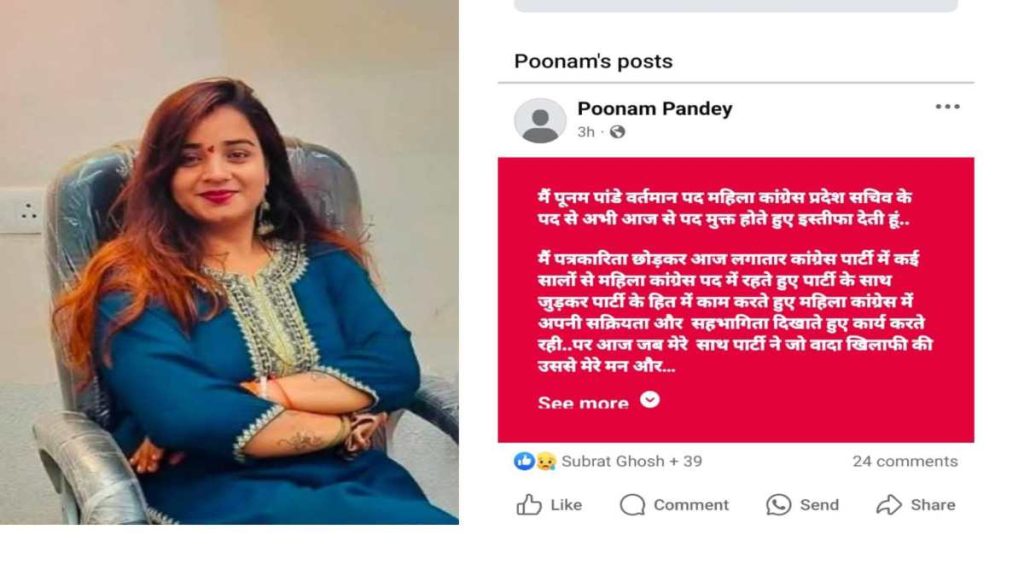 पूनम पांडे ने सोशल मीडिया में पोस्ट कर लिखा है कि मैं पूनम पांडे वर्तमान पद प्रदेश सचिव महिला कांग्रेस के पद से आज से पद मुक्त होते हुए इस्तीफा देती हूं, क्योंकि मेरे लिए आत्मसम्मान से बड़ा कुछ नहीं है. लोगों के लिए जमीनी स्तर पर काम कर सकूं, इसके लिए मैं टिकट मांग रही थी. मैं पत्रकारिता छोड़कर लगातार कांग्रेस पार्टी में कई सालों से महिला कांग्रेस पद में रहते हुए पार्टी के साथ जुड़कर पार्टी के हित में काम किया. महिला कांग्रेस में अपनी सक्रियता और सहभागिता दिखाते हुए काम करती रही, पर आज जब मेरे साथ पार्टी ने अनदेखा किया है.