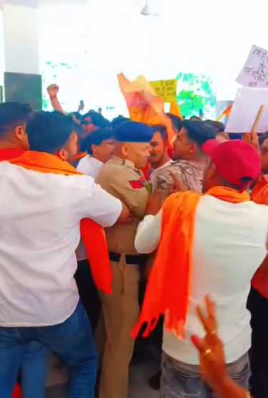 वीरेंद्र गहवई, बिलासपुर. गुरु घासीदास विश्वविद्यालय के एनएसएस कैंप में हिंदू छात्रों को जबरदस्ती नमाज पढ़ाने के मामले में आज छात्रों व हिंदू संगठन के लोगों ने विश्वविद्यालय में जमकर हंगामा मचाया. प्रदर्शनकारी दोषियों पर सख्त कार्रवाई की मांग पर अड़े हैं. वाइस चांसलर को हटाने की मांग को लेकर छात्र यूनिवर्सिटी के प्रशासनिक भवन के गेट पर चढ़कर प्रदर्शन कर रहे. प्रदर्शनकारी जीजीयू नहीं बनेगा जेएनयू के नारे लगा रहे. इस दौरान प्रदर्शनकारियों की पुलिस से झूमाझटकी भी हुई.