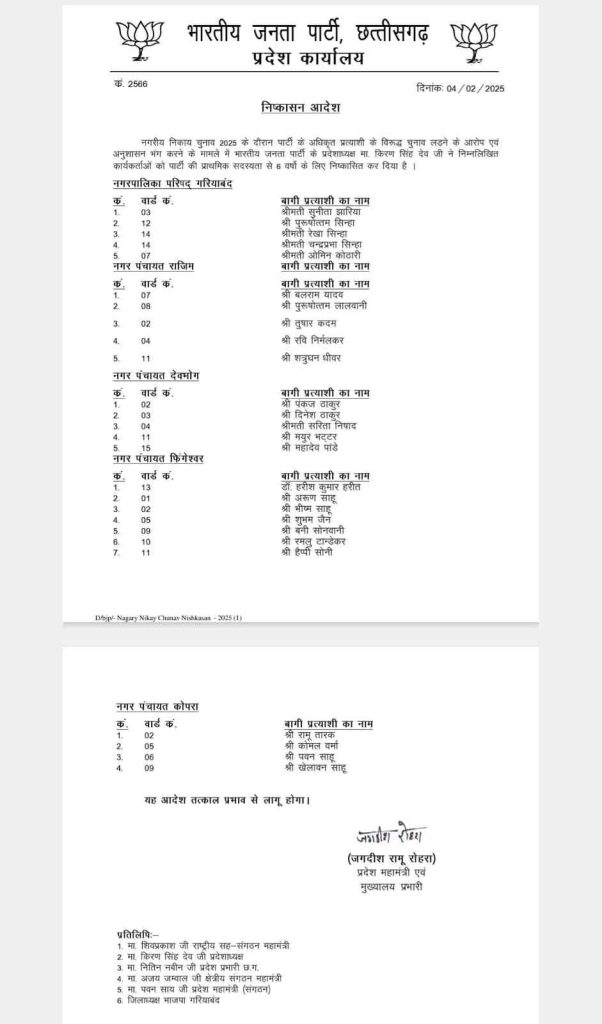पुरुषोत्तम पात्र, गरियाबंद. नगरीय निकाय चुनाव में भाजपा के अधिकृत प्रत्याशी के खिलाफ चुनाव लड़ने वाले 26 भाजपाइयों को भाजपा ने पार्टी से 6 साल के लिए निष्कासित कर दिया है. गरियाबंद पालिका में 5, राजिम नगर पंचायत से 5, कोपरा नगर पंचायत से 4, देवभोग से 5 व फिंगेश्वर नगर पंचायत से 7 बागी भाजपाइयों को पार्टी ने बाहर का रास्ता दिखा दिया है.
