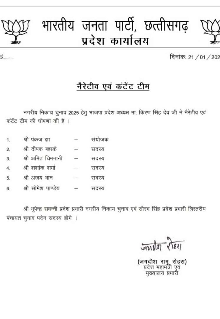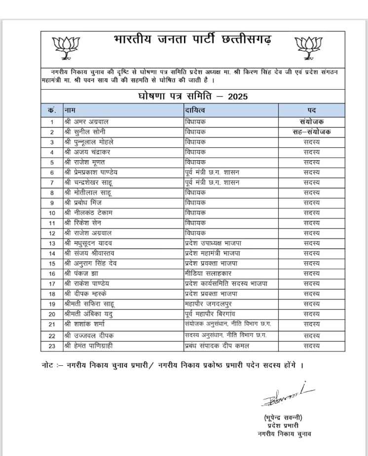 रायपुर. छत्तीसगढ़ में नगरीय निकाय चुनाव के लिए भाजपा ने 23 सदस्यीय घोषणा पत्र समिति बनाई है. इस समिति के संयोजक पूर्व मंत्री अमर अग्रवाल, सह संयोजक विधायक सुनील सोनी को बनाए गए हैं. वहीं भाजपा ने नैरेटीव एवं कंटेंट टीम का भी गठन किया है, जिसके संयोजक पंकज झा को बनाए गए हैं.