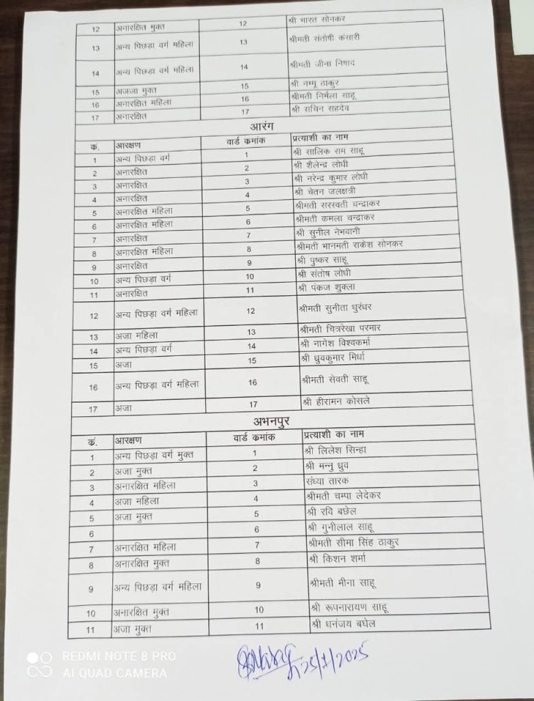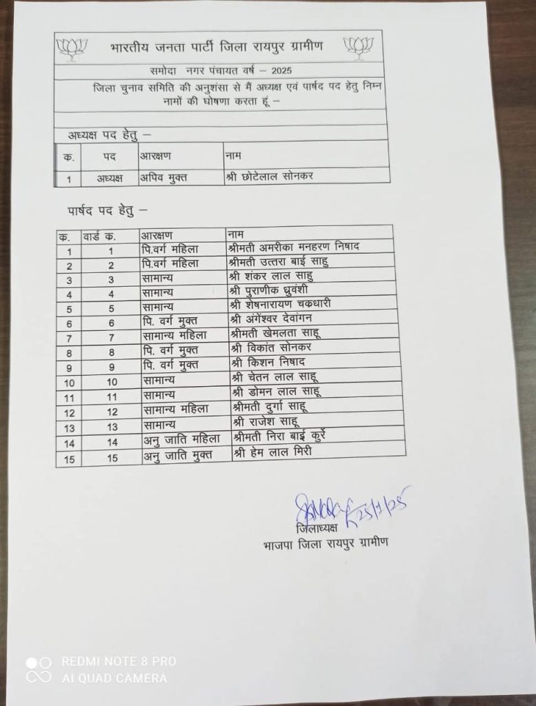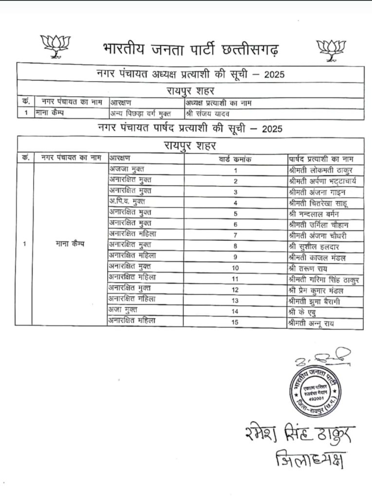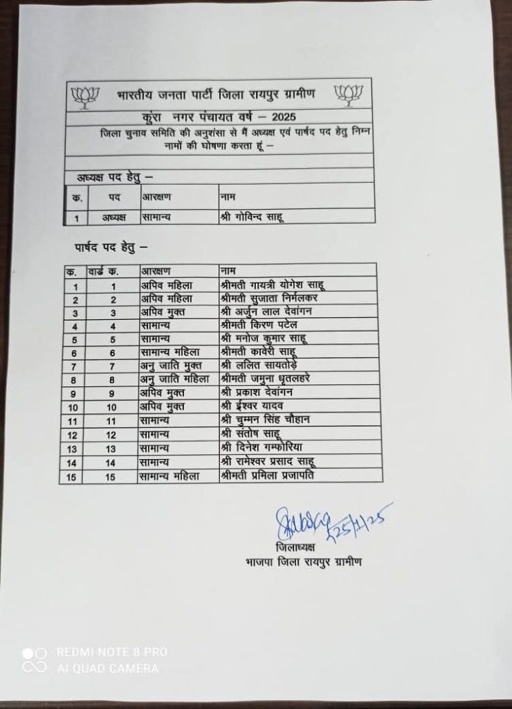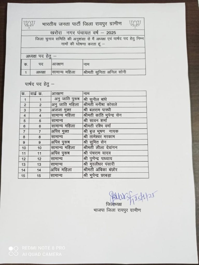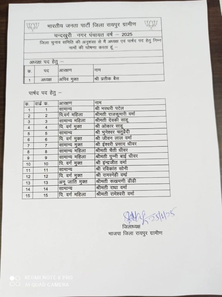 रायपुर। छत्तीसगढ़ में आगामी नगरीय निकाय चुनाव के लिए बीजेपी ने राजधानी रायपुर के समोदा, कुंरा, चंदखुरी, मंदिरहसौद, खरोरा और माना नगर पंचायत के कई वार्डों में अपने प्रत्याशियों के नामों का ऐलान किया है। इसके साथ ही चंदखुरी, कुंरा, समोदा और खरोरा में अध्यक्ष पद के लिए भी प्रत्याशियों के नामों की घोषणा की है, जबकि नगर पालिका तिल्दा नेवरा और गोबरा-नवापारा, आरंग, अभनपुर नगर पालिका के वार्डों में पार्षद प्रत्याशियों के नामों की लिस्ट भी जारी की गई है।