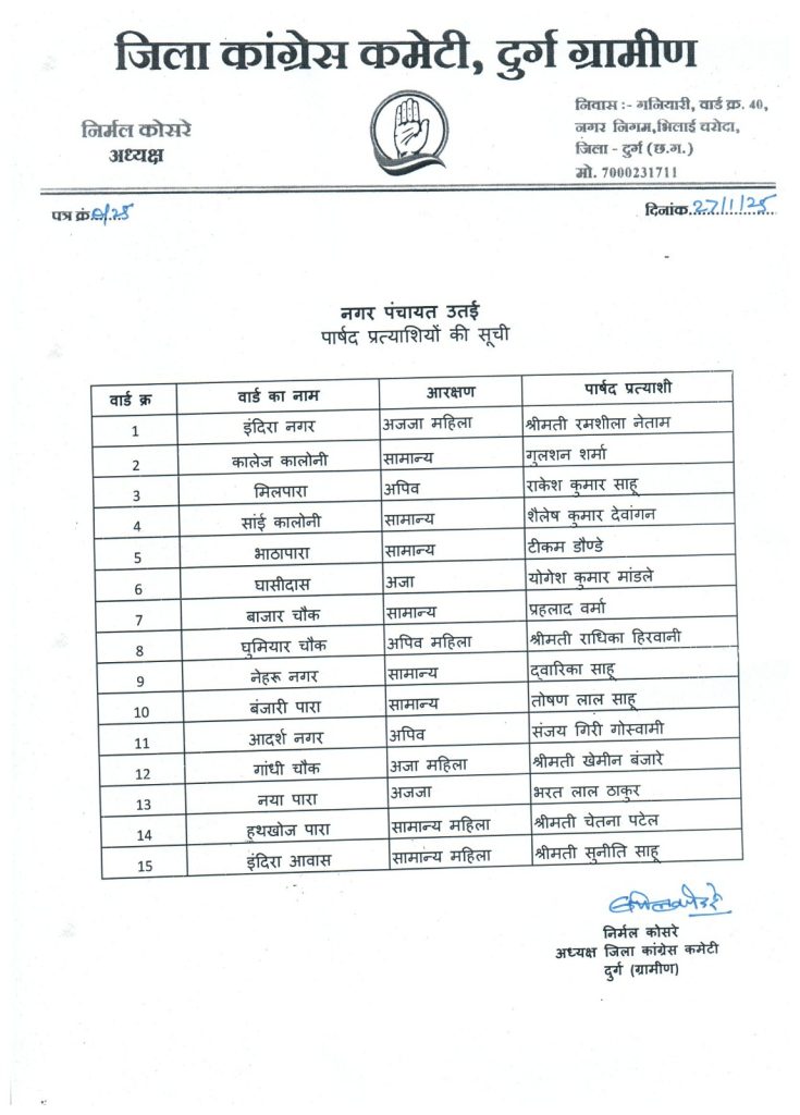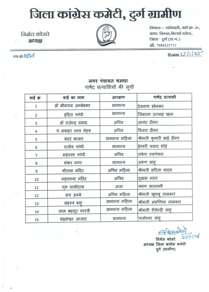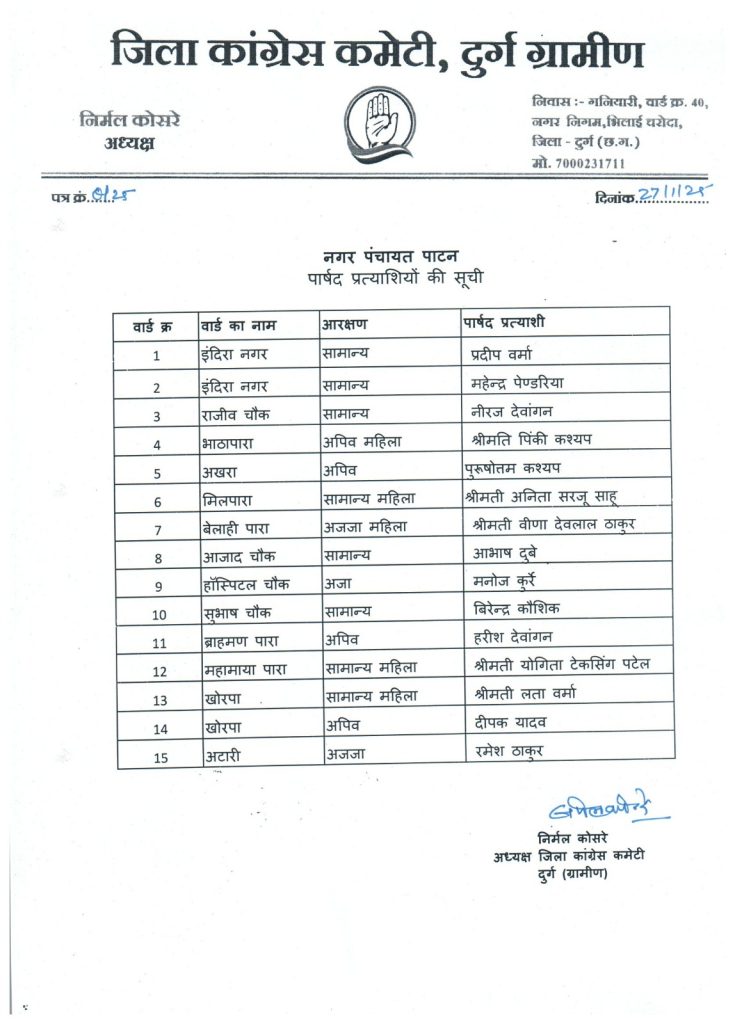 लक्षिका साहू, रायपुर. नगरीय निकाय चुनाव को लेकर राजनीतिक दल एक्टिव मोड में है. छत्तीसगढ़ कांग्रेस ने आज दुर्ग जिले के नगर पंचायत धमधा, पाटन और उतई के पार्षद प्रत्याशियों की लिस्ट जारी कर दी है. जिला कांग्रेस कमेटी की ओर से जारी लिस्ट में तीनों नगर पंचायत के 15 पार्षद प्रत्याशियों के नाम शामिल हैं.