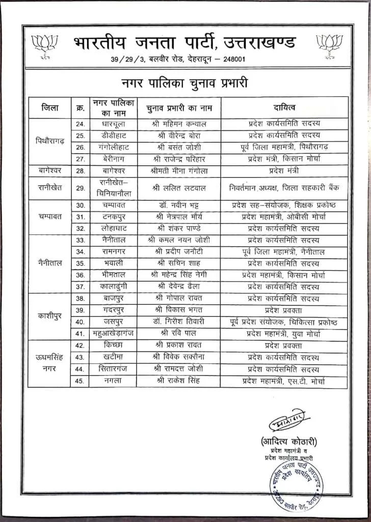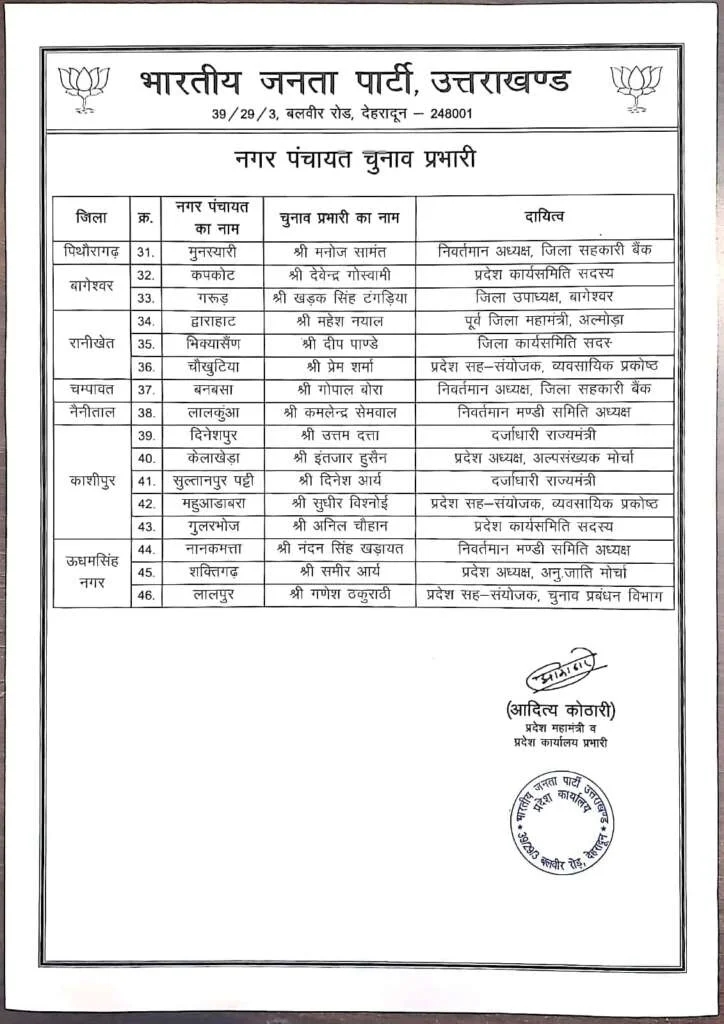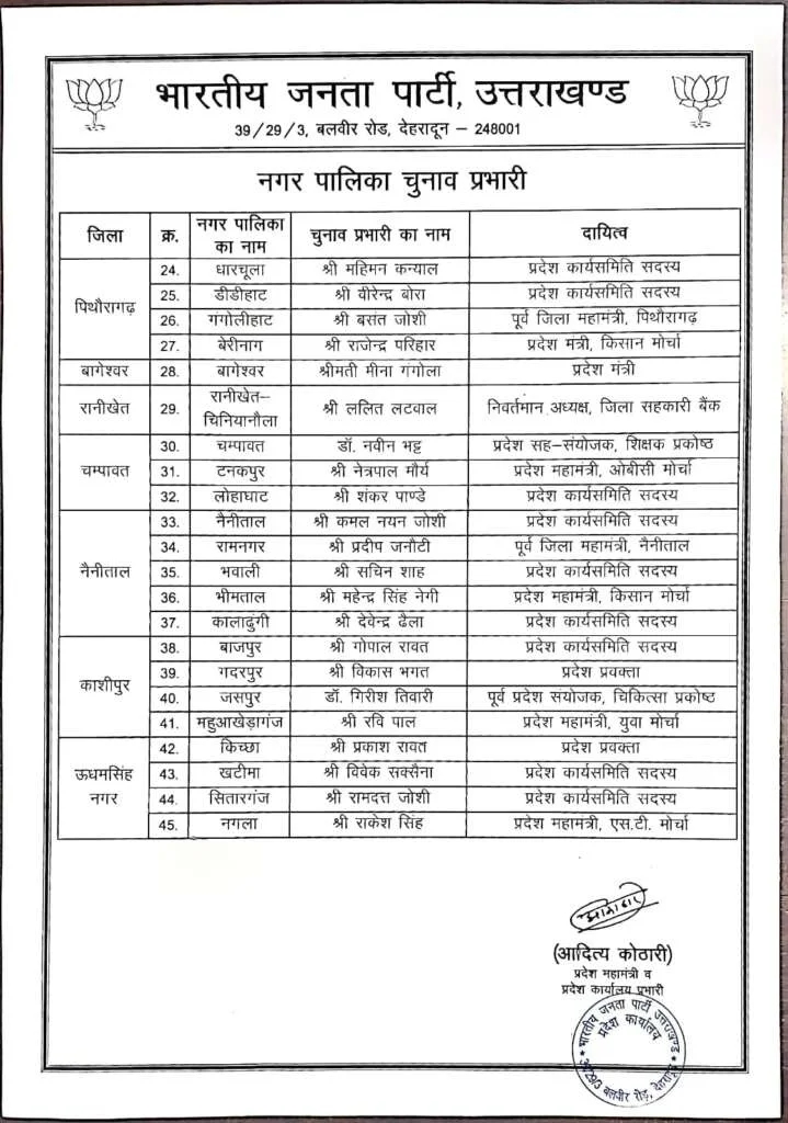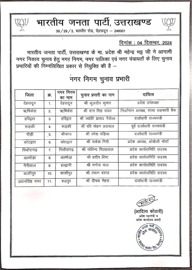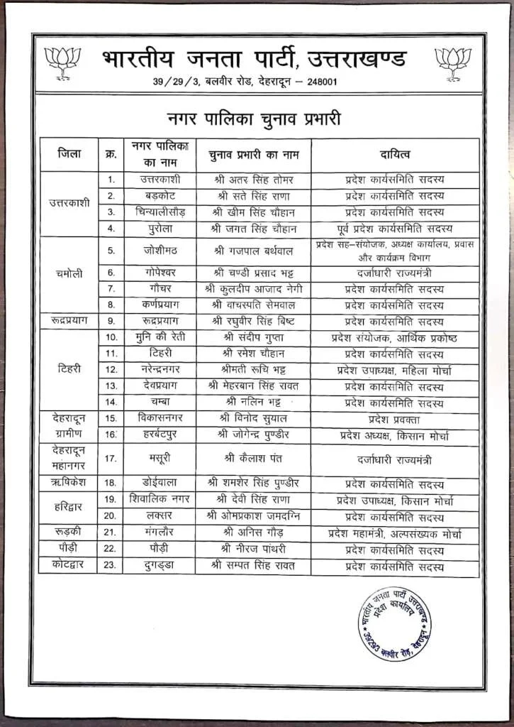 भाजपा प्रदेश मीडिया प्रभारी मनवीर सिंह चौहान ने बताया कि प्रदेश अध्यक्ष महेंद्र भट्ट के निर्देश पर प्रदेश महामंत्री आदित्य कोठारी ने चुनाव प्रभारियों की सूची जारी की है। इसके तहत 11 नगर निगमों, 45 नगर पालिका परिषदों और 46 नगर पंचायतों में चुनाव प्रभारी बनाए गए हैं।