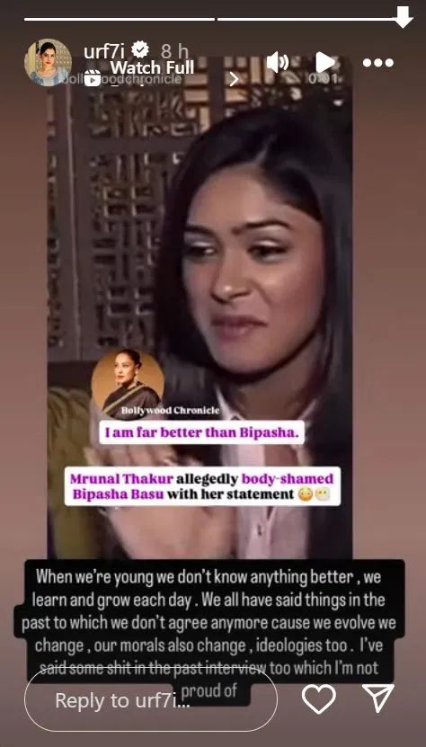 बता दें कि उर्फी जावेद (Urfi Javed) ने अपने इंस्टाग्राम की स्टोरी पर एक पोस्ट शेयर करके मृणाल ठाकुर (Mrunal Thakur) का बचाव किया है. सोशल मीडिया सेंशेशन ने अपने इंस्टा स्टोरी पर लिखा ‘जब हम युवा होते हैं तो हमें कुछ भी बेहतर नहीं पता होता, हम हर दिन सीखते और बढ़ते हैं. हम सभी ने अतीत में ऐसी बातें कही हैं, जिनसे अब हम सहमत नहीं हैं, क्योंकि हम विकसित होते हैं, बदलते हैं, हमारे नैतिक मूल्य भी बदलते हैं. विचारधाराओं में भी बदलाव होता है. मैंने पिछले इंटरव्यू में भी कुछ ऐसी बातें कही हैं, जो मुझे पसंद नहीं हैं’.