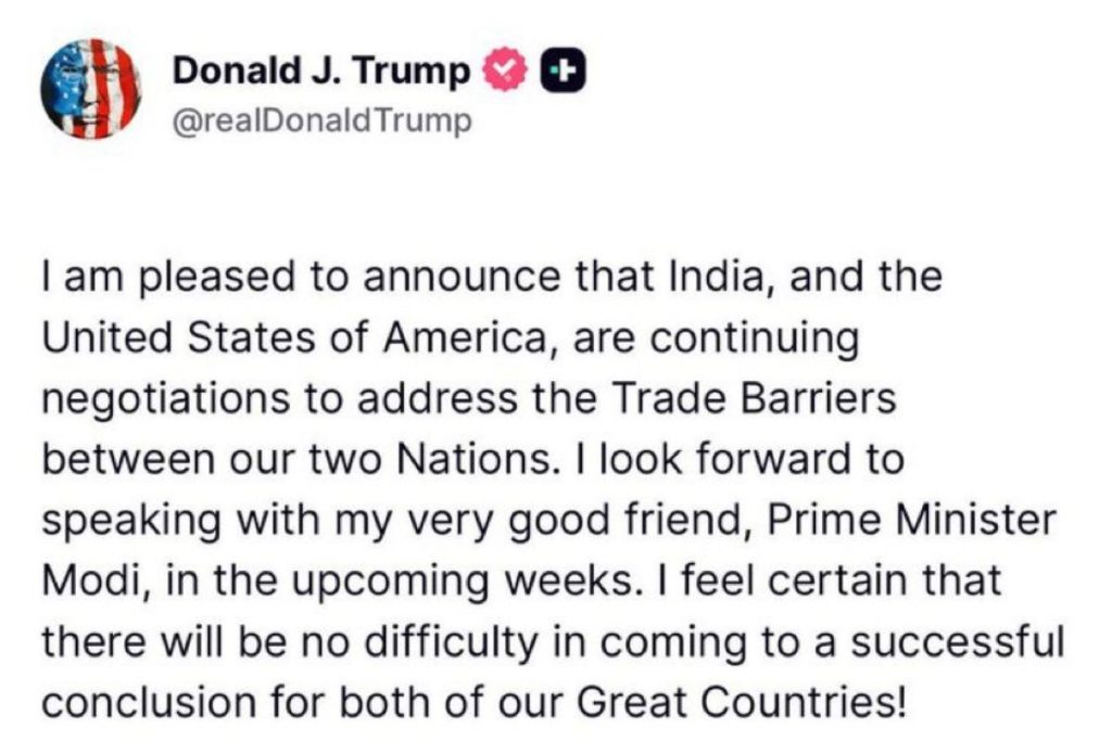दरअसल ट्रंप ने सोशल मीडिया प्लेटफॉर्म ट्रुथ सोशल पर पोस्ट में लिखा कि उन्हें यह घोषणा करते हुए खुशी हो रही है कि भारत और अमेरिका व्यापार बाधाओं को दूर करने के लिए बातचीत जारी रखे हुए हैं। अमेरिकी राष्ट्रपति ने कहा कि मैं अपने बहुत अच्छे दोस्त, प्रधानमंत्री मोदी से आगामी हफ्तों में बातचीत करने के लिए उत्सुक हूं। मुझे पूरा यकीन है कि हमारे दोनों महान देशों के लिए इस वार्ता का सफल निष्कर्ष निकलेगा।