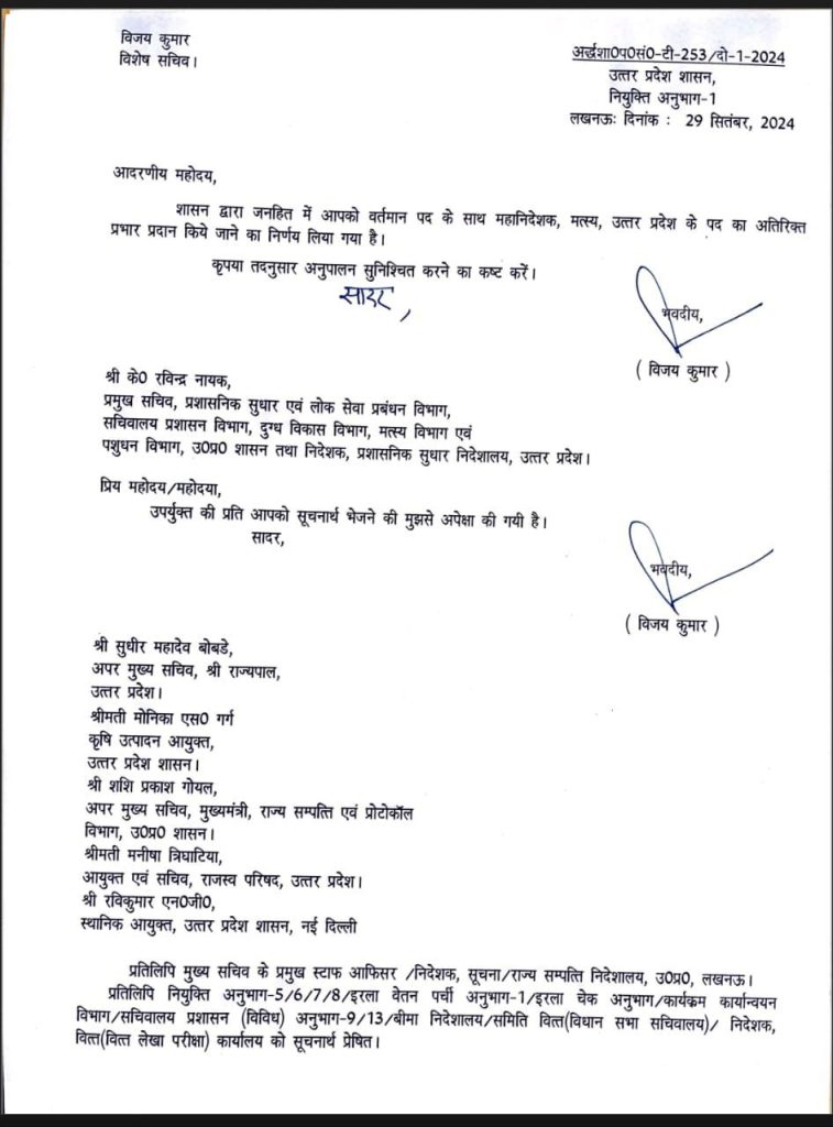 विक्रम मिश्र, लखनऊ. उत्तर प्रदेश में योगी आदित्यनाथ सरकार ने महानिदेशक मत्स्य का पद सृजित किया है. जिस पर के. रविन्द्र नायक आईएएस अधिकारी की तैनाती की गई है. बता दें कि मत्स्य महानिदेशक का पद पहली बार उत्तर प्रदेश के अबतक के इतिहास में सृजित हो रहा है. के रविन्द्र नायक अभी प्रमुख सचिव सचिवालय प्रशासन है. जबकि मत्स्य महानिदेशक के तौर पर उनको अतिरिक्त प्रभार सौंपा गया है.