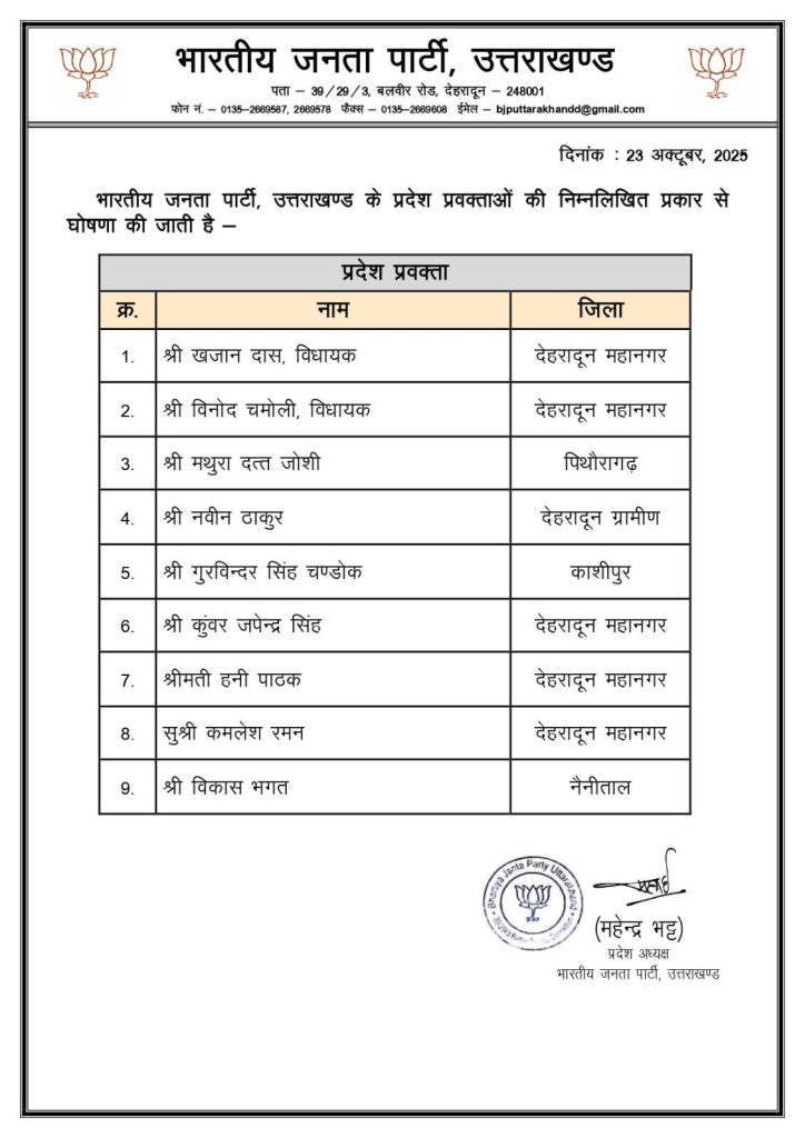 जारी सूची के मुताबिक देहरादून महानगर से पांच प्रवक्ता तो वहीं देहरादून ग्रामीण, पिथौरागढ़, काशीपुर और नैनीताल से एक-एक प्रदेश प्रवक्ता पार्टी द्वारा नियुक्त किया गया है। इस सूची में विधायक खजान दास, विधायक विनोद चमोली, मथुरा दत्त जोशी, नवीन ठाकुर, गुरविन्दर सिंह चण्डोक, कुंवर जपेन्द्र सिंह, हनी पाठक, कमलेश रमन और विकास भगत का नाम शामिल है।