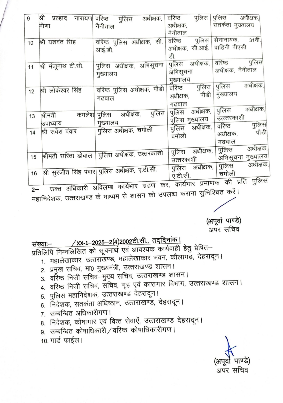 Uttarakhand IPS Transfers: उत्तराखंड में एक बार फिर तबादला एक्सप्रेस चली है। धामी सरकार ने 16 IPS अधिकारियों का ट्रांसफर कर दिया है। SSP नैनीताल, पौड़ी गढ़वाल और ASP हल्द्वानी में बदलाव किया गया है। जारी सूची के मुताबिक IPS डॉ० पी.वी.के. प्रसाद को निदेशक अभियोजन से हटाकर अपर पुलिस महानिदेशक (अभिसूचना एवं सुरक्षा) नियुक्त किया गया है।