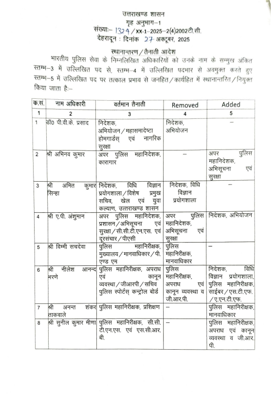वहीं IPS ए.पी. अंशुमान अब एडीजी, विधि विज्ञान प्रयोगशाला के प्रमुख होंगे। अभिनव कुमार को एडीजी कारागार से हटाकर निदेशक अभियोजन बनाया गया है। शंकर अनन्त ताकवाले को IG मानवाधिकार बनाया गया है। जबकि नीलेश आनंद भरणे को अब IG साइबर, STF और ANTF का कार्यभार दिया गया है। वहीं सुनील कुमार मीणा अब IG अपराध एवं कानून व्यवस्था व जीआरपी होंगे।