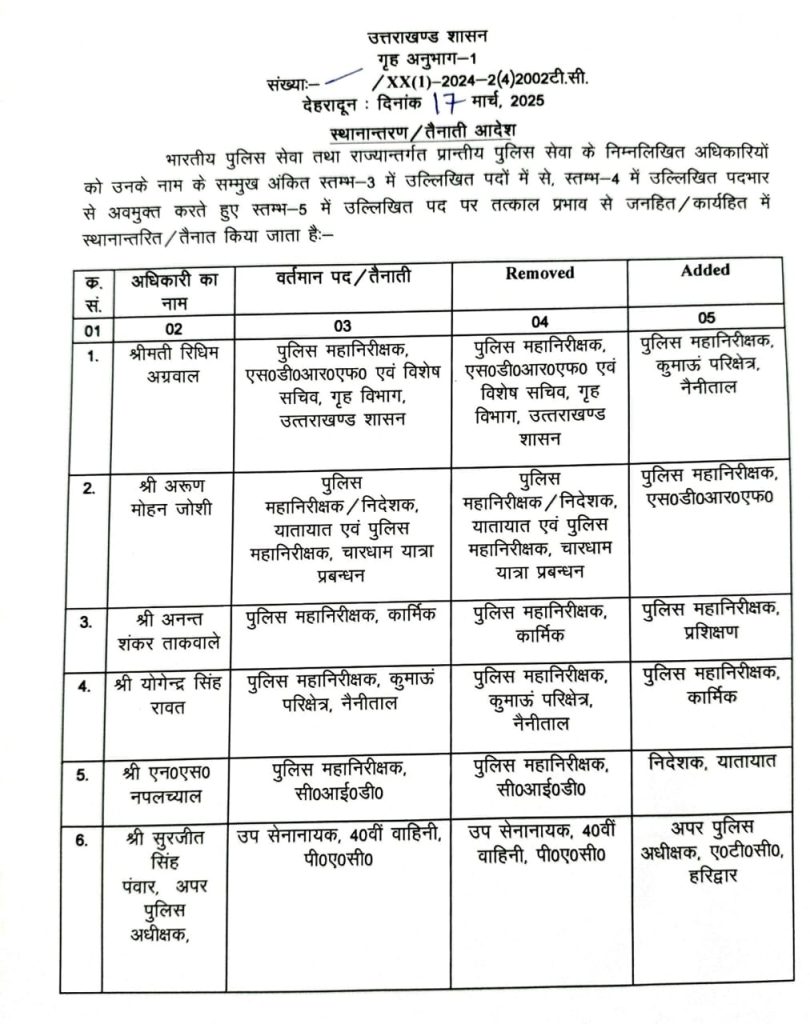 READ MORE : उत्तराखंड में बड़ी प्रशासनिक सर्जरी : कई IAS और PCS अधिकारियों का ट्रांसफर, जानिए किसे मिली कहां की जिम्मेदारी