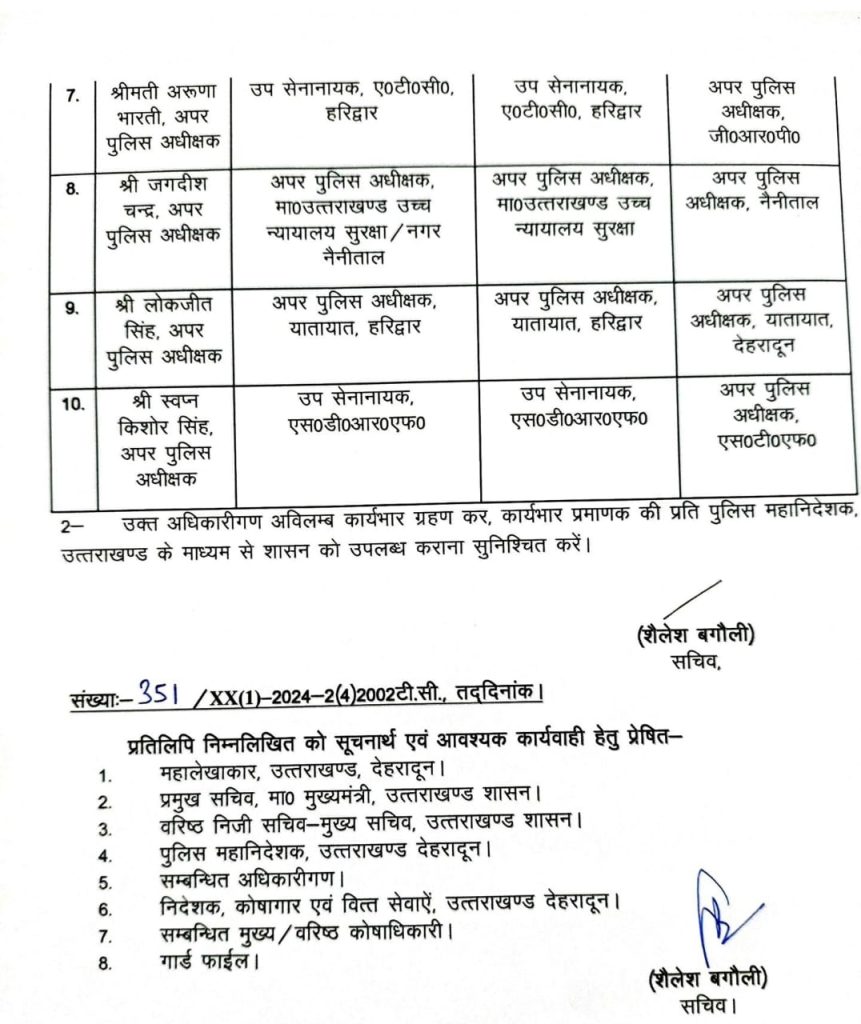 Uttarakhand IPS Transfer : वहीं अरुण भारती को अपर पुलिस अधीक्षक जीआरपी और सुरजीत सिंह पंवार को हरिद्वार जिले के अपर पुलिस अधीक्षक अटक बनाया गया हैं। लोकजीत सिंह को देहरादून में अपर पुलिस अधीक्षक यातायात और स्वप्न किशोर सिंह को अपर पुलिस अधीक्षक एसटीएफ की जिम्मेदारी दी गई हैं। जबकि जगदीश चंद्र को अपर पुलिस अधीक्षक नैनीताल बनाया गया है।