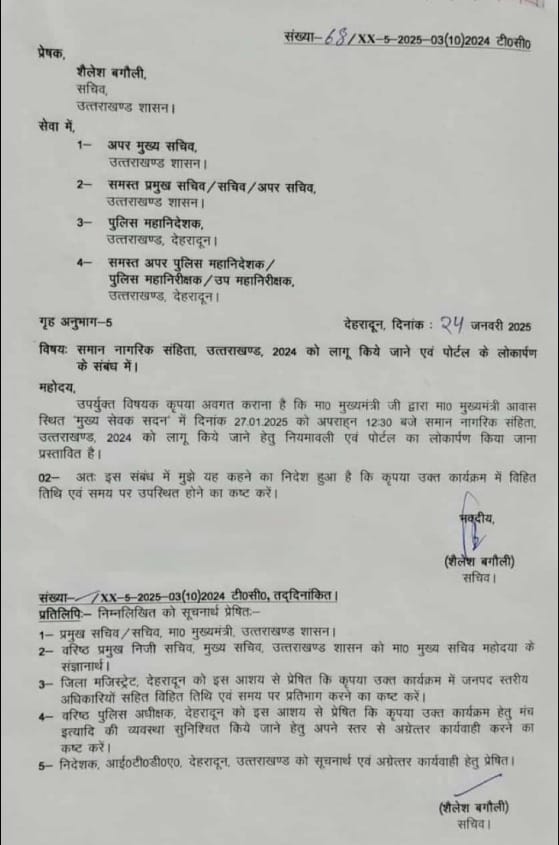 देहरादून. उत्तराखंड से बड़ी खबर सामने आई है. 27 जनवरी को उत्तराखंड में UCC लागू होगा. सीएम पुष्कर सिंह धामी यूसीसी पोर्टल का लोकार्पण करेंगे. सीएम आवास के सभागार में यह कार्यक्रम होगा, जिसमें सभी वरिष्ठ अधिकारी शामिल होंगे.