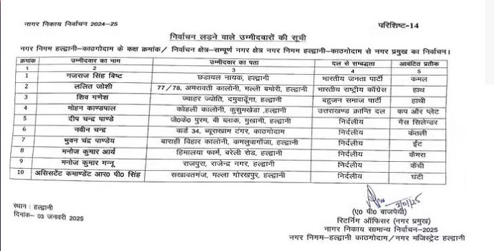 बता दें कि हल्द्वानी नगर निगम क्षेत्र से मेयर पद के दावेदार कांग्रेस प्रत्याशी ललित जोशी को हाथ का पंजा, भाजपा प्रत्याशी गजराज सिंह बिष्ट को कमल का फूल, बसपा प्रत्याशी शिव गणेश को हाथी और उक्रांद प्रत्याशी मोहन कांडपाल को कप और प्लेट चुनाव चिन्ह आवंटित किया गया है.