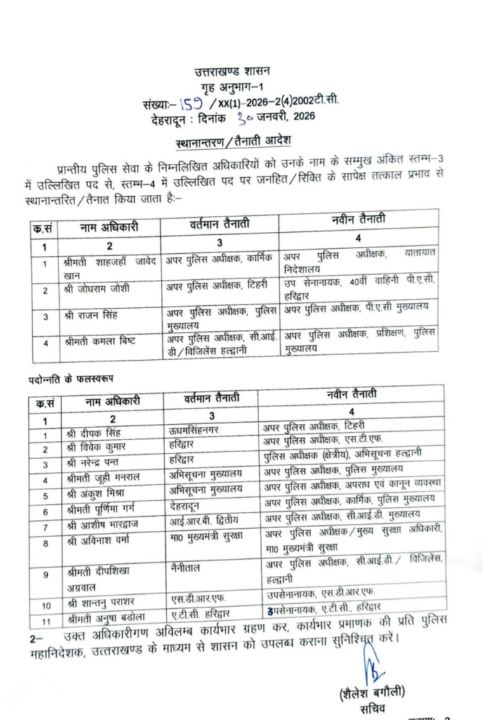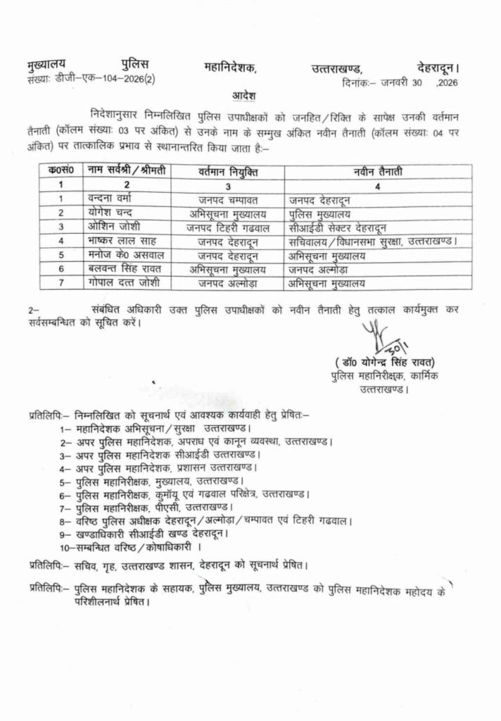 अविनाश वर्मा को मुख्यमंत्री सुरक्षा से मुख्य सुरक्षा अधिकारी मुख्यमंत्री सुरक्षा और दीपशिखा अग्रवाल को नैनीताल से विजिलेंस हल्द्वानी ट्रांसफर किया गया है। शांतनु पाराशर एसडीआरएफ में ही अब उपसेनानायक होंगे और अनुषा बडोला एटीसी हरिद्वार में ही उपसेनानायक रहेंगी। इनके अलावा पुलिस मुख्यालय ने जिन डीएसपी के तबादले किए हैं उनमें वंदना शर्मा को चंपावत से देहरादून (भेजा) लाया गया है।