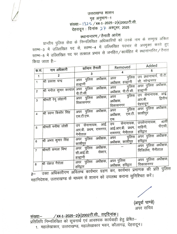 Uttarakhand PPS Transfers: उत्तराखंड में एक बार फिर तबादला एक्सप्रेस चली है। धामी सरकार ने 8 PPS अधिकारियों का ट्रांसफर कर दिया है। एसटीएफ में तैनात स्वप्न किशोर सिंह को ASP काशीपुर बनाया गया है। प्रकाश चन्द्र को ASP हल्द्वानी से हटाकर PTC नरेंद्रनगर भेजा गया। उनकी जगह मनोज कुमार कत्याल को नया ASP हल्द्वानी तैनात किया गया है। रेनू लोहानी को उप सेनानायक, IRB द्वितीय देहरादून तैनात किया गया है। पंकज गैरोला अब ASP विकासनगर होंगे।