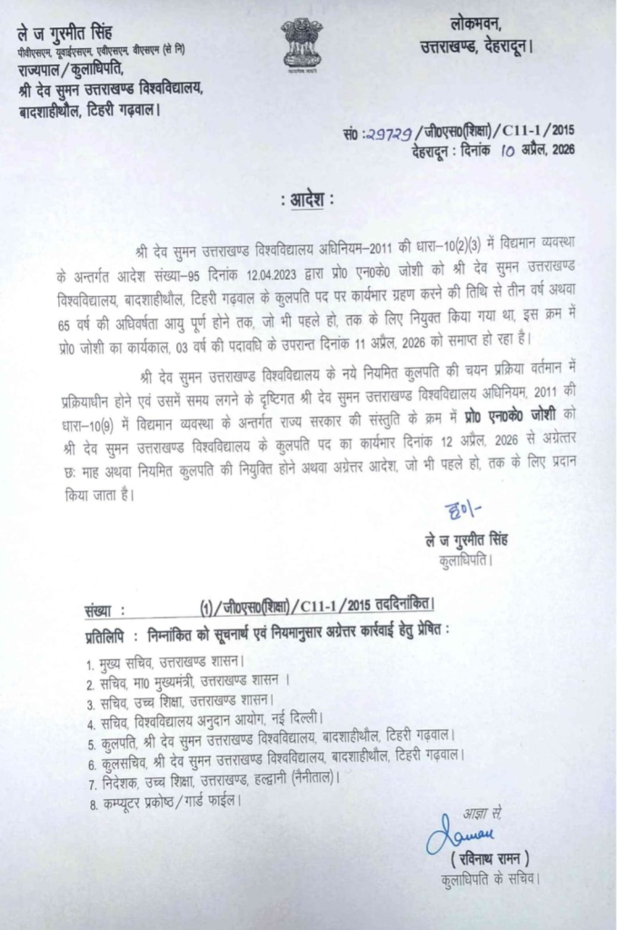 लोकभवन की ओर से जारी आदेश में लिखा है कि ‘देव सुमन उत्तराखण्ड विश्वविद्यालय अधिनियम-2011 की धारा 10(2)(3) में विद्यमान व्यवस्था के अन्तर्गत आदेश संख्या-95 12.04.2023 द्वारा प्रो. एन. के. जोशी को देव सुमन उत्तराखण्ड विश्वविद्यालय, बादशाहीथौल, टिहरी गढ़वाल के कुलपति पद पर कार्यभार ग्रहण करने की तिथि से तीन वर्ष या 65 वर्ष की अधिवर्षता आयु पूर्ण होने तक, जो भी पहले हो, तक के लिए नियुक्त किया गया था, इस क्रम में प्रो० जोशी का कार्यकाल. 03 वर्ष की पदावधि के उपरान्त 11 अप्रैल, 2026 को समाप्त हो रहा है.’