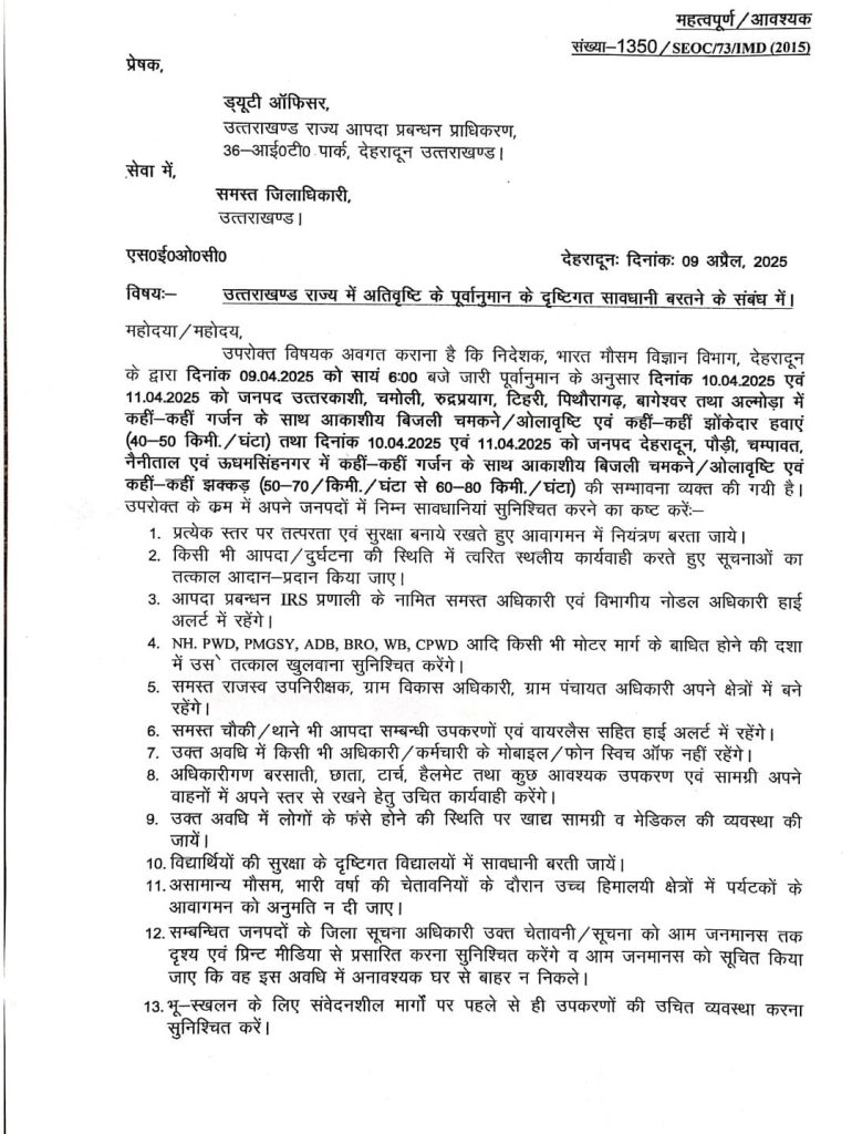 भारत मौसम विज्ञान विभाग, देहरादून द्वारा दिनांक 09.04.2025 को सायं 6:00 बजे जारी पूर्वानुमान के अनुसार, दिनांक 10.04.2025 एवं 11.04.2025 को जनपद उत्तरकाशी, चमोली, रुद्रप्रयाग, टिहरी, पिथौरागढ़, बागेश्वर तथा अल्मोड़ा में कहीं-कहीं गर्जन के साथ आकाशीय बिजली चमकने/ओलावृष्टि एवं कहीं-कहीं झोंकेदार हवाएं (40-50 किमी./घंटा) की सम्भावना व्यक्त की गयी है।