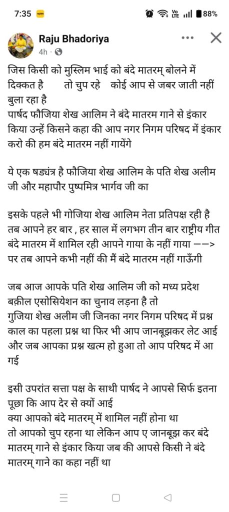 कांग्रेस पार्षद ने सोशल मीडिया पर पोस्ट कर कहा- फोजिया शेख अलीम नगर निगम में नेता प्रतिपक्ष रही है। फोजिया शेख अलीम साल में तीन बार आयोजित होने वाली परिषद सम्मेलन में हमेशा समय से शामिल रही है। कांग्रेस पार्षद ने आरोप लगाया कि फौजिया शेख अलीम ने जानबूझकर वंदे मातरम को मुद्दा बनाया है।