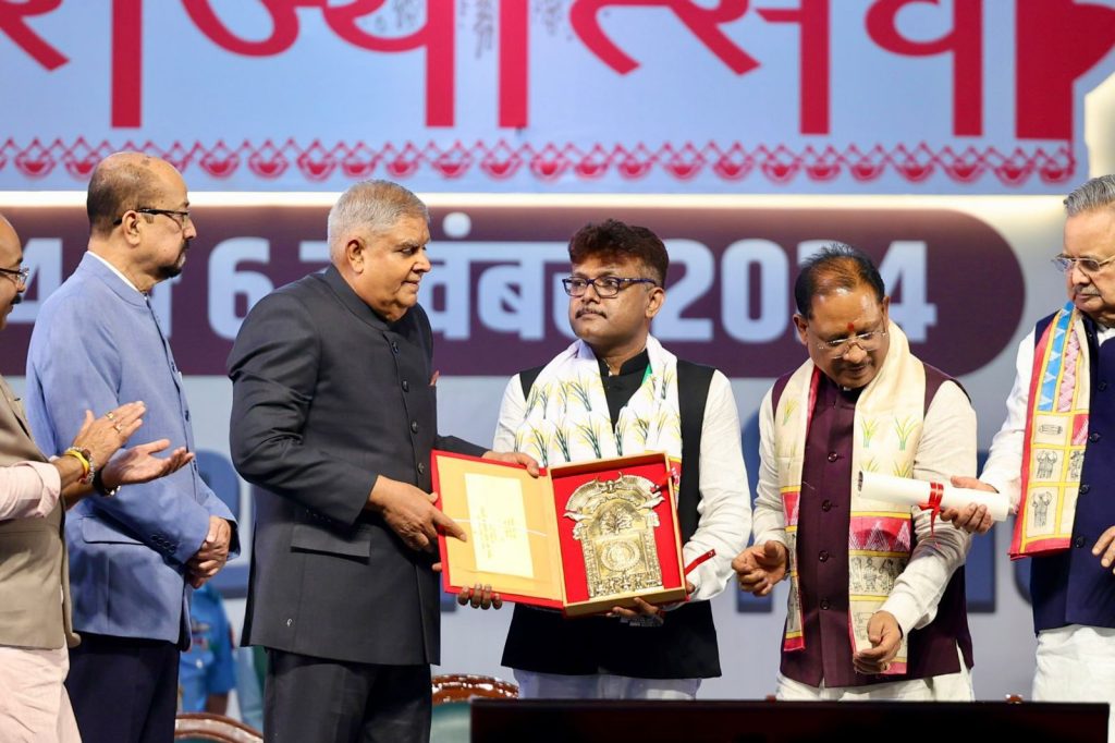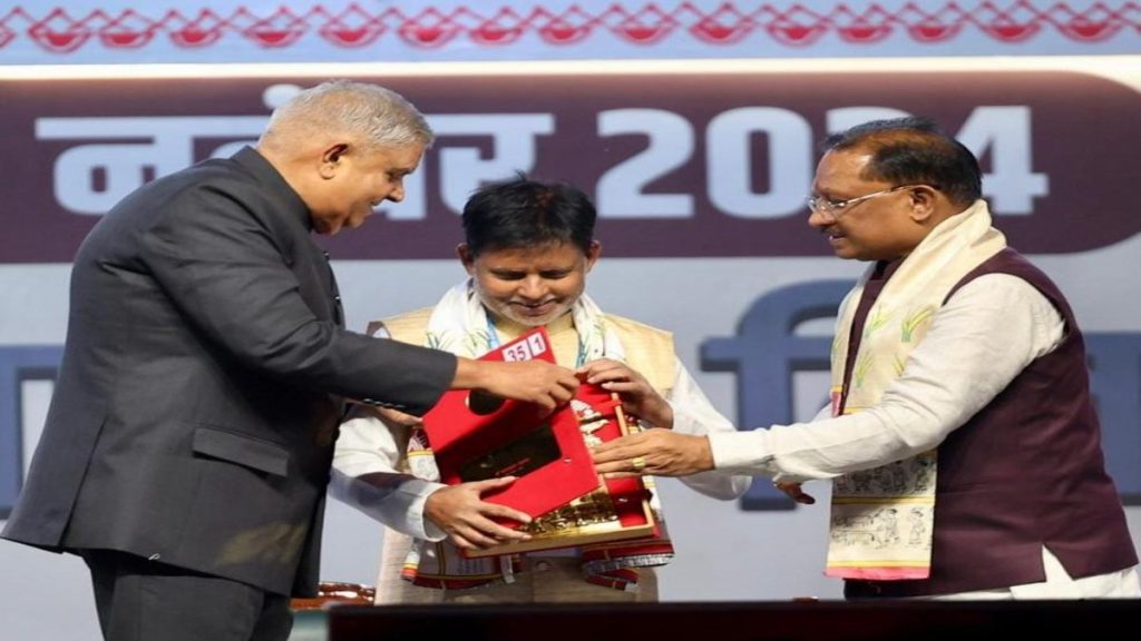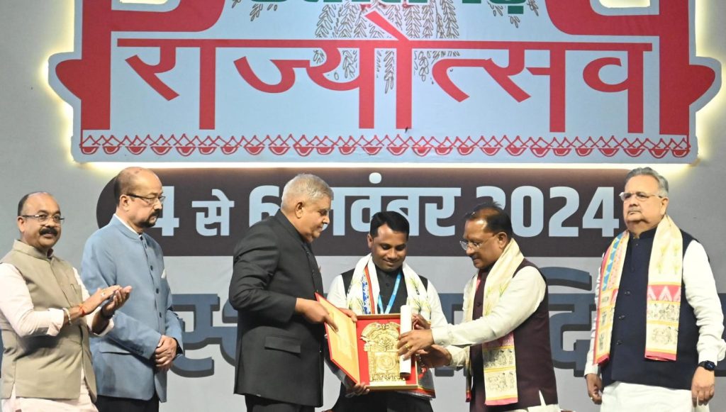 रायपुर. छत्तीसगढ़ राज्य स्थापना दिवस के अवसर पर आयोजित तीन दिवसीय राज्योत्सव के समापन और राज्य अलंकरण समारोह के अवसर पर मुख्य अतिथि उपराष्ट्रपति जगदीप धनखड़ शामिल हुए. उन्होंने कार्यक्रम को सम्बोधित करते हुए कहा कि विकसित भारत के निर्माण के लिए सबकी भागीदारी की जरूरत है. इसमें छत्तीसगढ़ का योगदान बढ़चढ़कर होगा. उन्होंने कहा कि छत्तीसगढ़ देश के लिए एक मिसाल, यहां मुख्यमंत्री विष्णु देव साय के नेतृत्व में विकास के नये कीर्तिमान बन रहे हैं. इस मौके पर उन्होंने राज्य अलंकरण से सम्मानित सभी विभूतियों कोे बधाई देते हुए कहा कि छत्तीसगढ़ के 36 सम्मान, जिन्हें देखकर मुझे ऊर्जा मिली है.