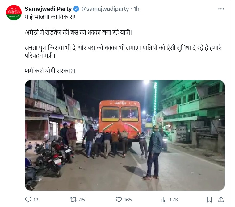बस के ड्राइवर ने कहा कि, बस लखनऊ गई थी और वहां से आ रही थी लेकिन सेल्फ खराब होने की वजह से बीच सड़क खड़ी हो गई। बस के खराब होने पर समाजवादी पार्टी ने भी निशाना साधा है और अपने एक्स हैंडल पर लिखा है कि, जनता पूरा किराया भी दे और बस में धक्का भी लगाए। यात्रियों को ऐसी सुबिधा दे रहे हैं हमारे परिवहन मंत्री, शर्म करो योगी सरकार।