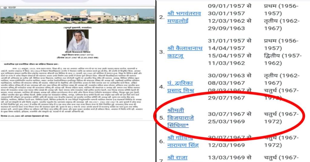 इतना ही नहीं जिस समय विजया राजे सिंधिया को मुख्यमंत्री बताया गया, उसी कार्यकाल में वेबसाइट पर गोविंद नारायण सिंह को भी मुख्यमंत्री बताया गया। आपको बता दें कि विजयाराजे सिंधिया मौजूदा केंद्रीय मंत्री ज्योतिरादित्य सिंधिया की दादी है। विजयाराजे विधायक रहीं है लेकिन कभी भी मंत्री और मुख्यमंत्री नहीं बनी थीं।