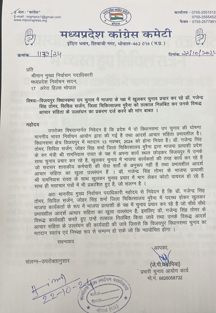 कांग्रेस चुनाव कार्य प्रभारी जे पी धनोपिया ने मुख्य निर्वाचन अधिकारी को एक पत्र लिखा है। इसमें आरोप लगाया है कि मुरैना सिविल सर्जन डॉ गजेंद्र सिंह तोमर अपना काम छोड़कर भाजपा प्रत्याशी रामनिवास रावत के पक्ष में खुलकर प्रचार कर रहे हैं। यह आचार संहिता का उल्लंघन है। इस वजह से उन पर प्रकरण दर्ज तत्काल निलंबित किया जाए।
