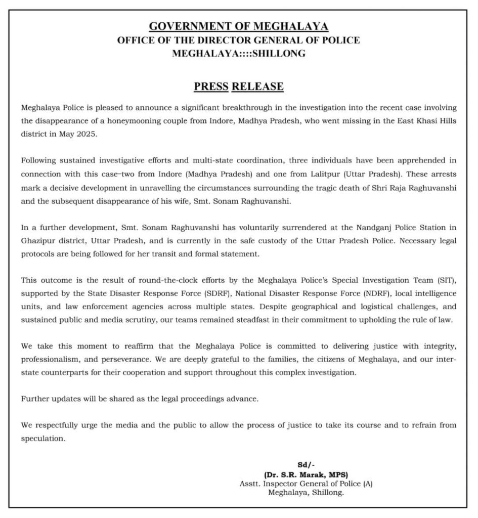 DGP ऑफिस की ओर से प्रेस नोट जारी किया गया है जिसके अनुसार, “सोनम रघुवंशी ने उत्तर प्रदेश के गाजीपुर जिले के नंदगंज पुलिस स्टेशन में स्वेच्छा से आत्मसमर्पण कर दिया है। वर्तमान में वह उत्तर प्रदेश पुलिस की हिरासत में हैं। उसके आने और औपचारिक बयान के लिए जरुरी कानूनी प्रोटोकॉल का पालन किया जा रहा है। यह परिणाम मेघालय पुलिस के विशेष जांच दल (SIT) के किए गए चौबीसों घंटे के प्रयासों का परिणाम है। जिसे राज्य आपदा प्रतिक्रिया बल (SDRF), राष्ट्रीय आपदा प्रतिक्रिया बल (NDRF), स्थानीय खुफिया इकाइयों और कई राज्यों की कानून प्रवर्तन एजेंसियों का समर्थन प्राप्त है।
